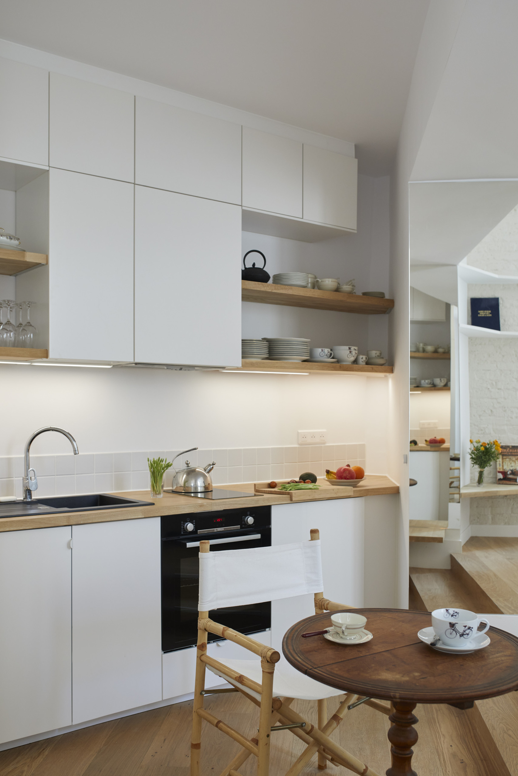 Dans la cuisine, le plan de travail et les étagères en rappel viennent épouser les angles en facettes des murs afin d’exploiter chaque recoin.