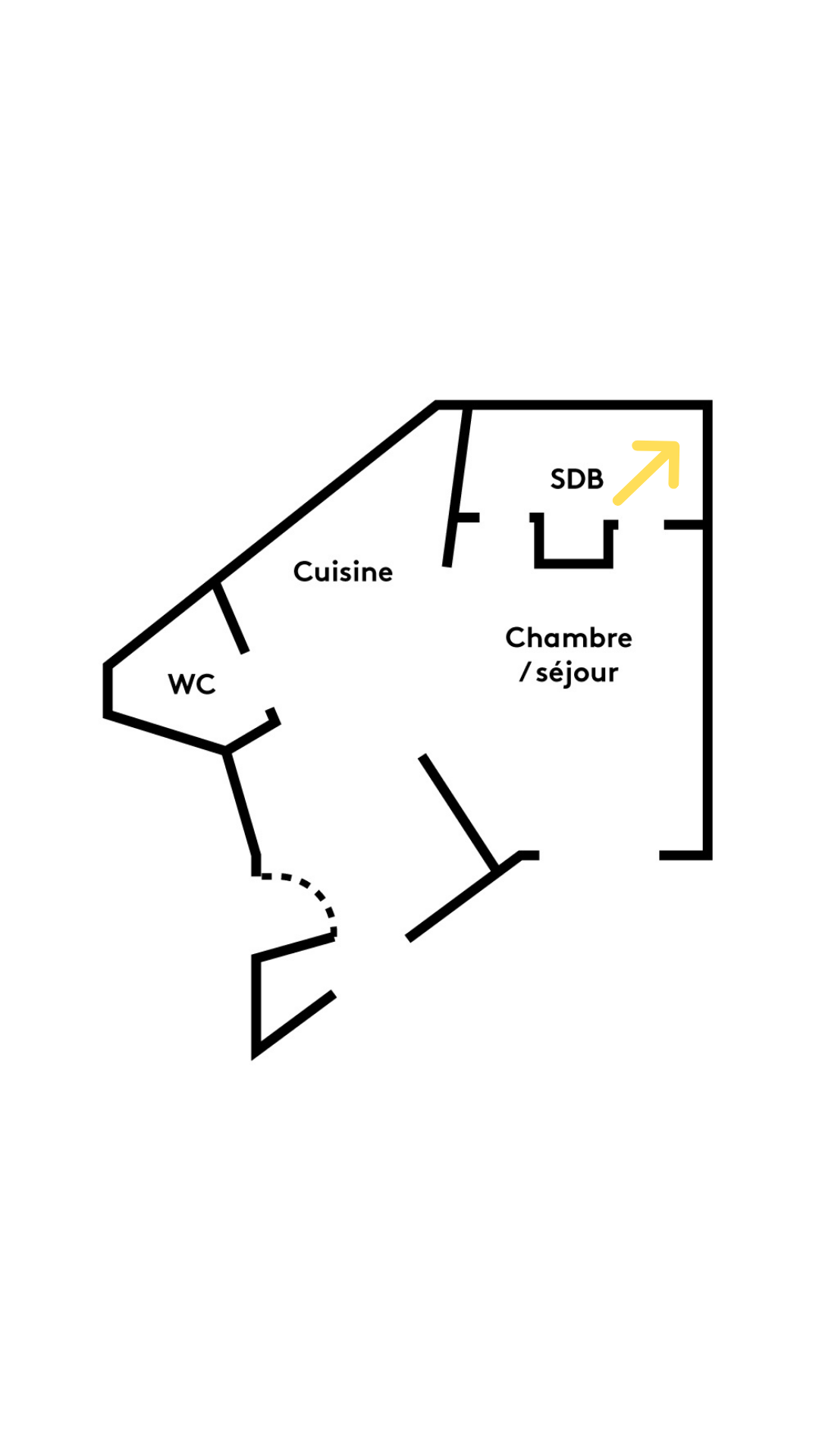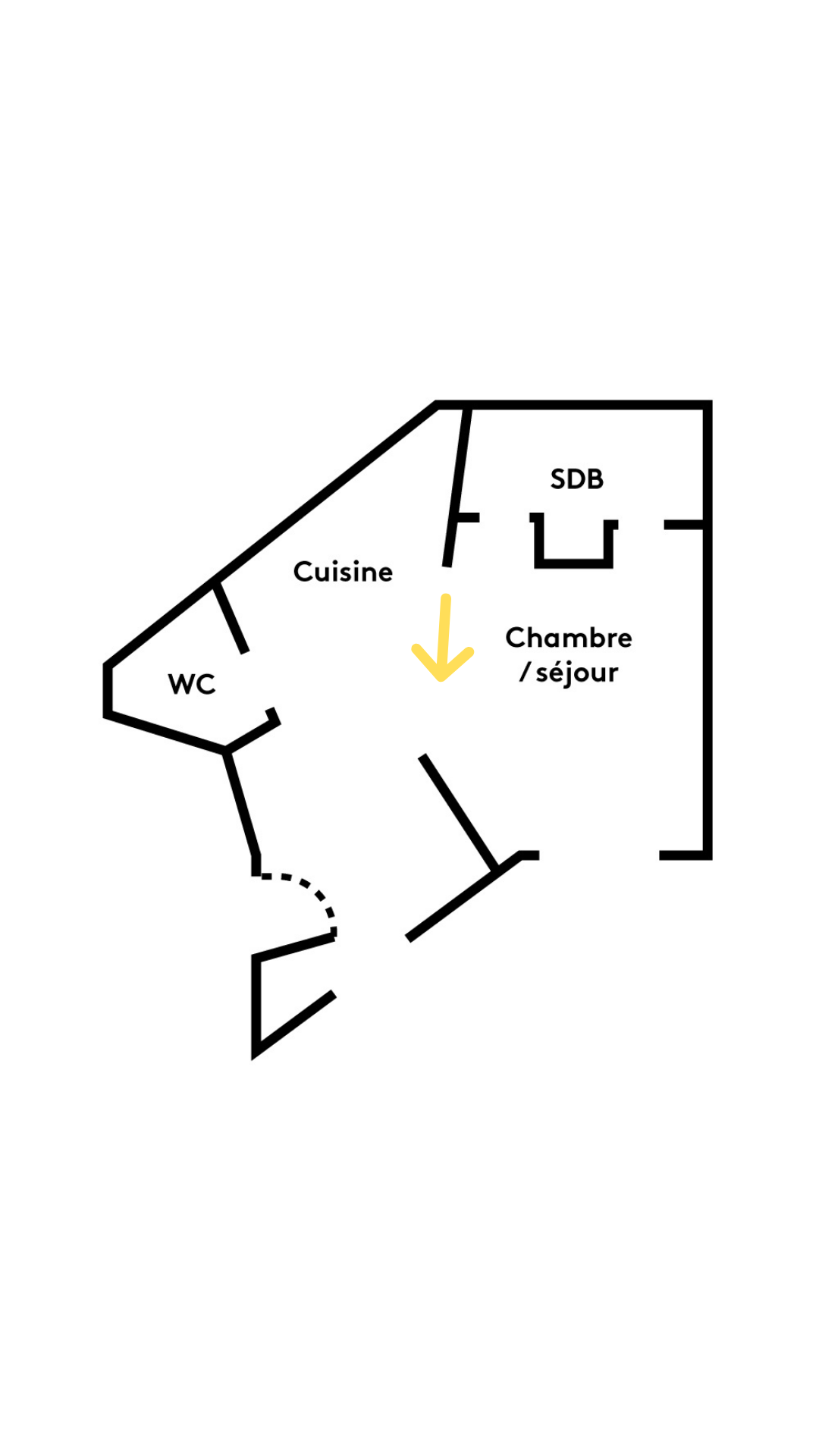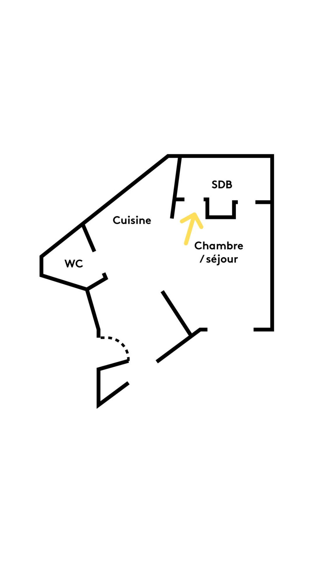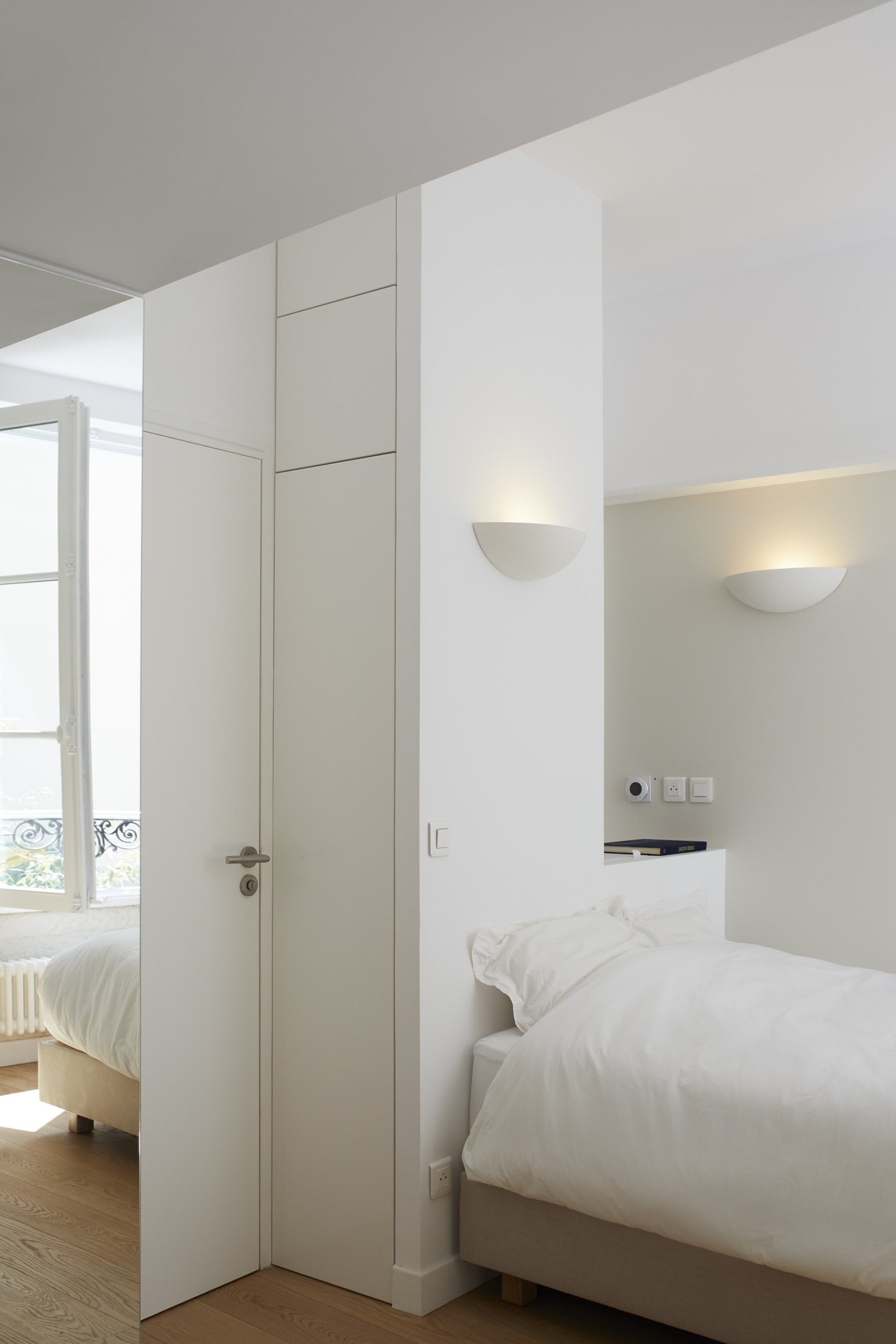 Dans cette pièce, tout a été optimisé : la cloison séparant la chambre de la salle d’eau accueille ainsi un espace de dépose en guise de chevet et une verrière pour faire circuler la lumière.