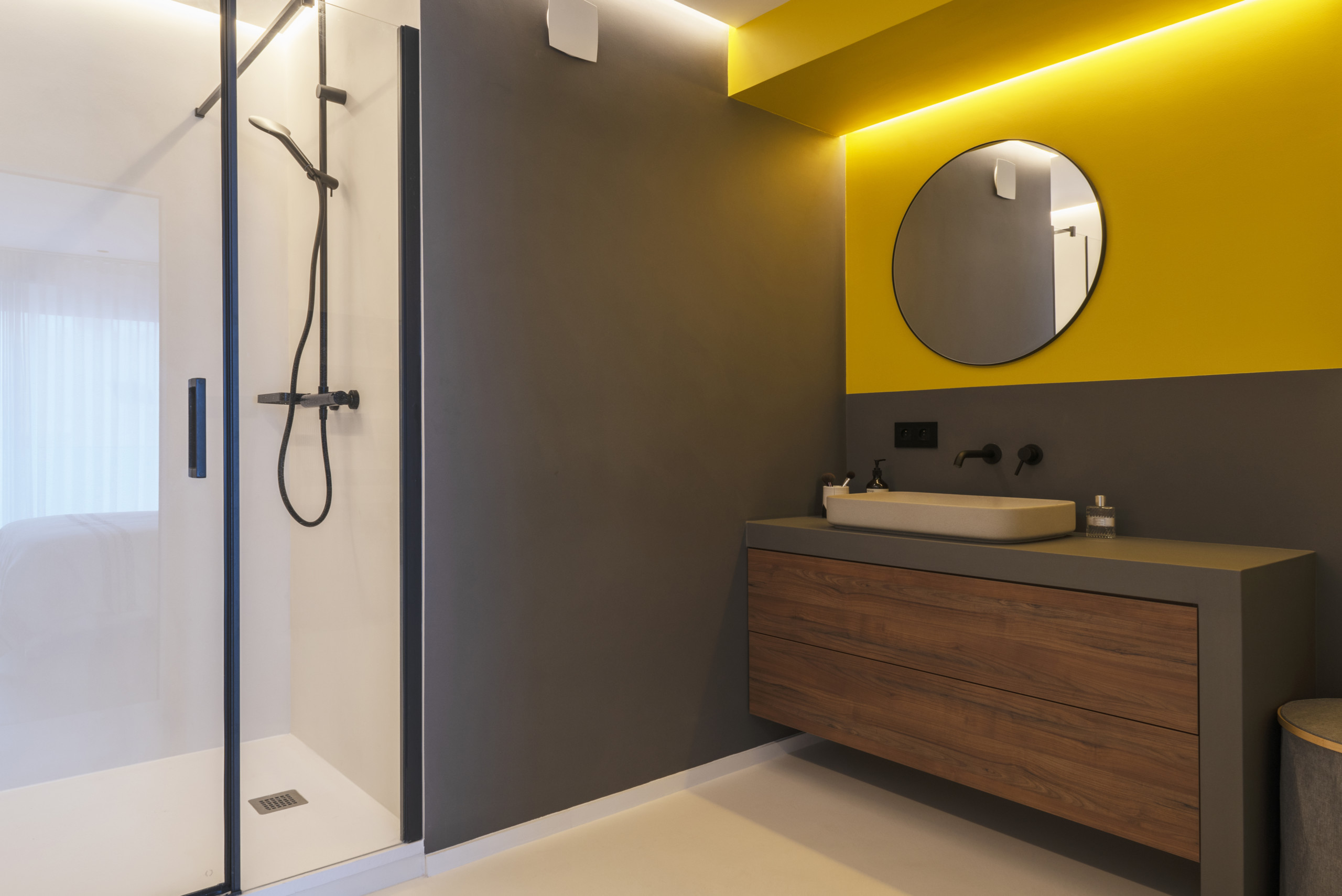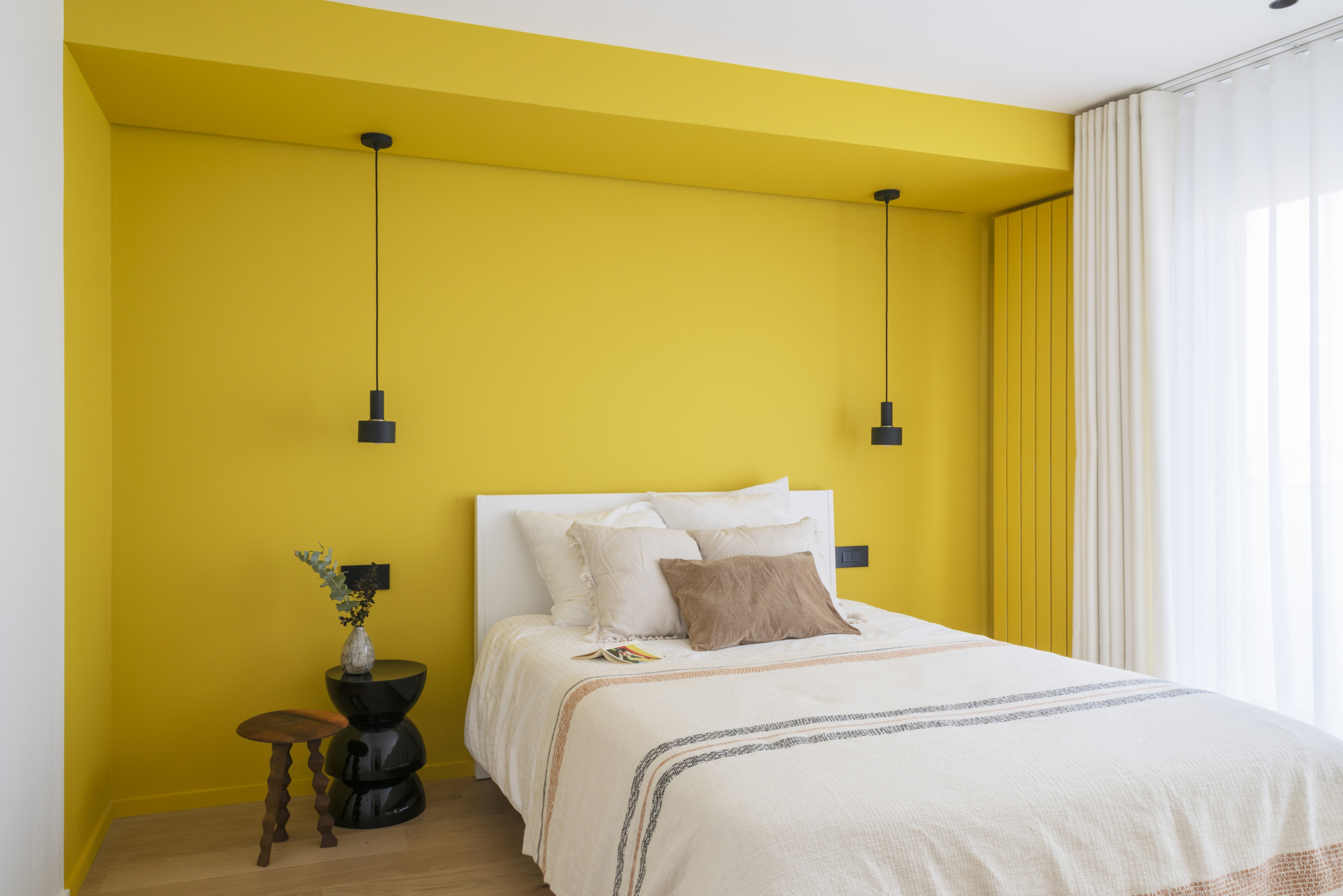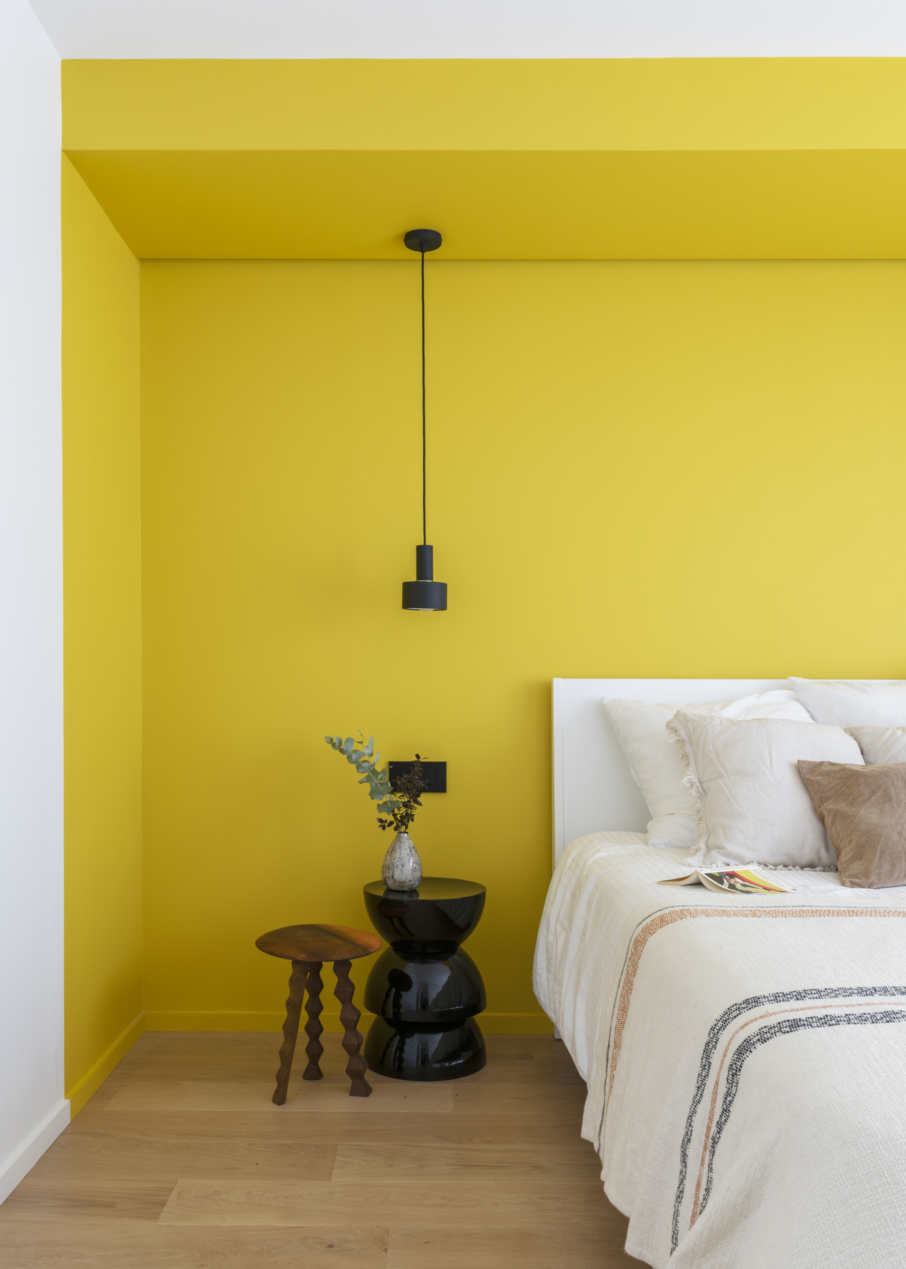 Dans la chambre, le décroché du faux plafond est le prétexte à une alcôve qui enveloppe la tête du lit. Le jaune solaire qui l’habille constituant l’élément phare de la pièce, l’ameublement se fait minimaliste.