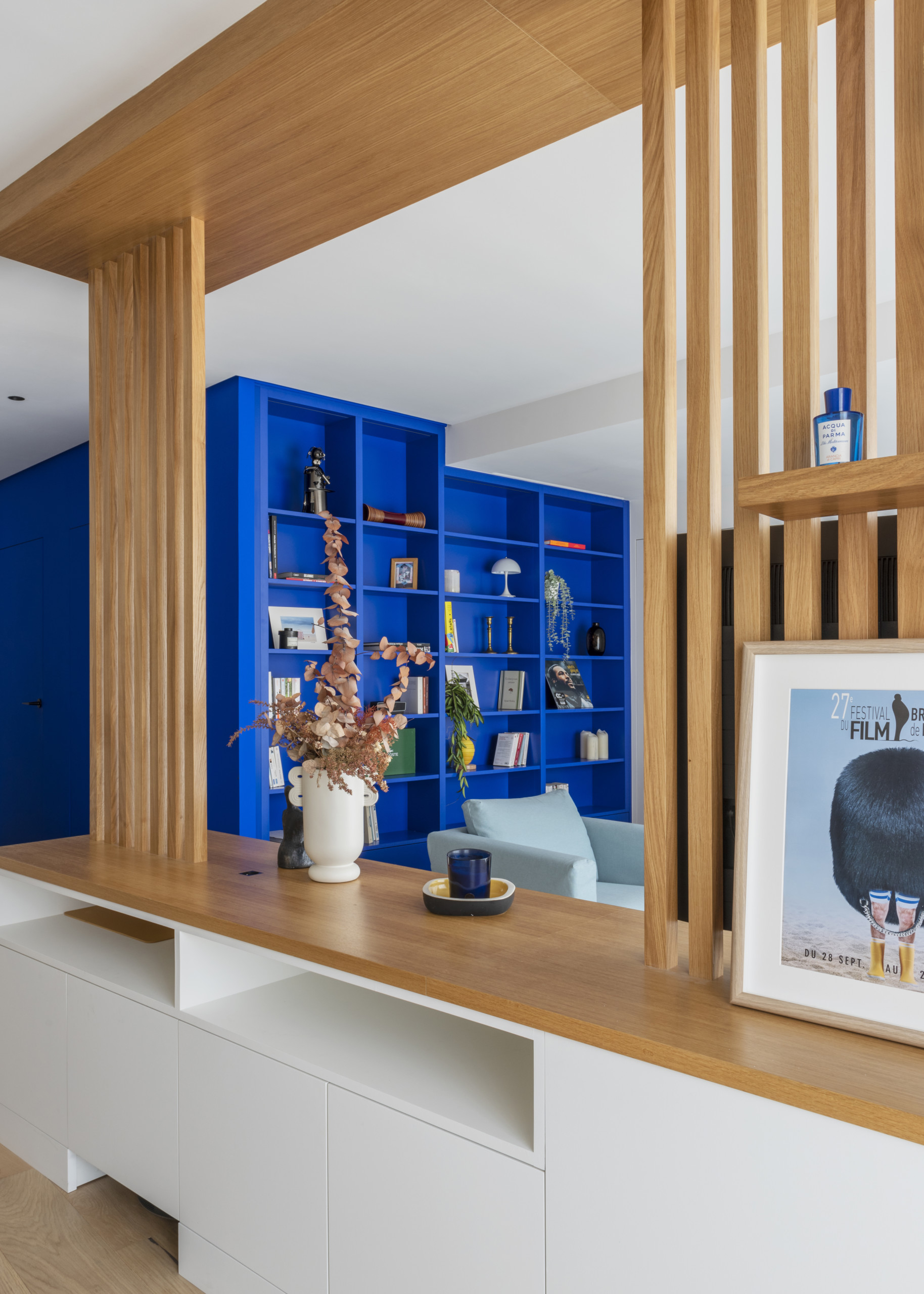 Ce bleu iconique se décline de l’entrée jusqu’à la bibliothèque du salon, pour ajouter une touche déco audacieuse à ce séjour épuré.