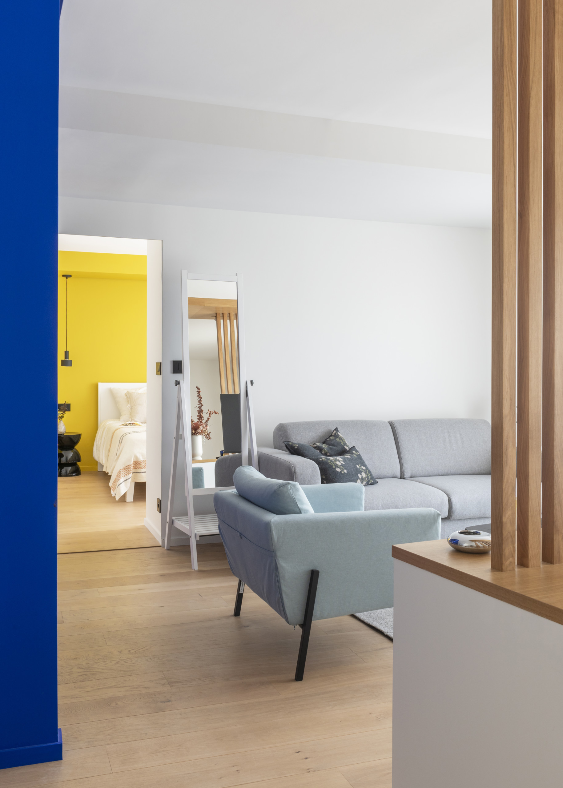 Où que l’on se dirige, l’œil est attiré par des perspectives soignées. Le placement d’un miroir de plein pied ou encore l’application de la couleur dynamisent l’ensemble et lui confèrent de la profondeur.