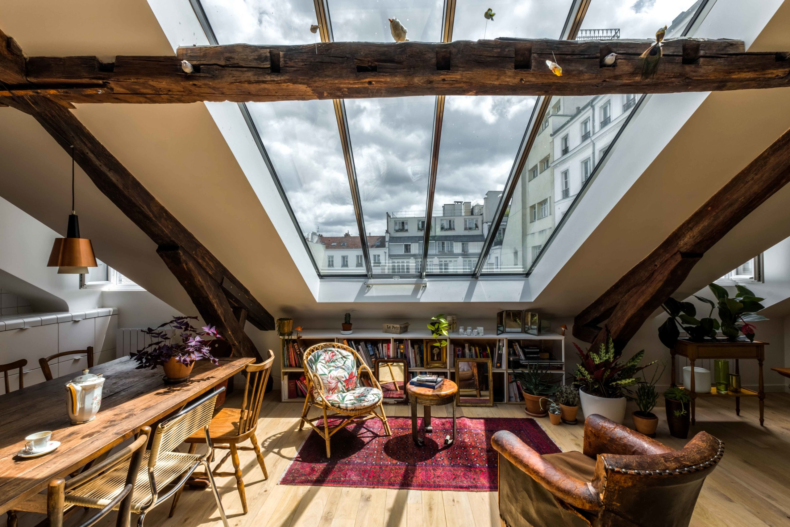 Quelle entrée spectaculaire ! L’espace s’ouvre littéralement sur l’extérieur avec l’installation de cette immense fenêtre de toit motorisée.