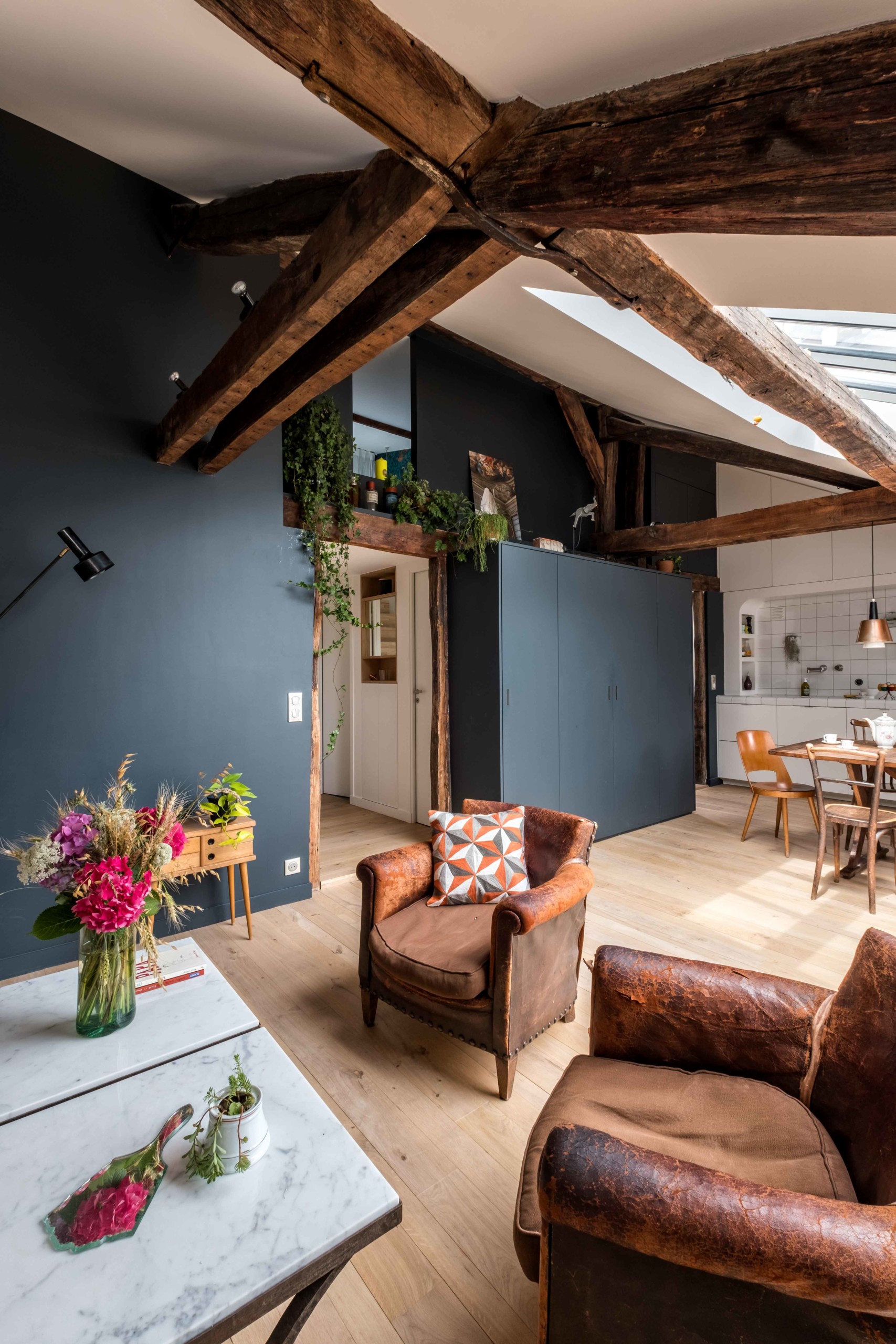 La forte pente du toit n’est plus un problème avec la récupération de 15 m² de combles. En bonus, la charpente d’origine est valorisée.