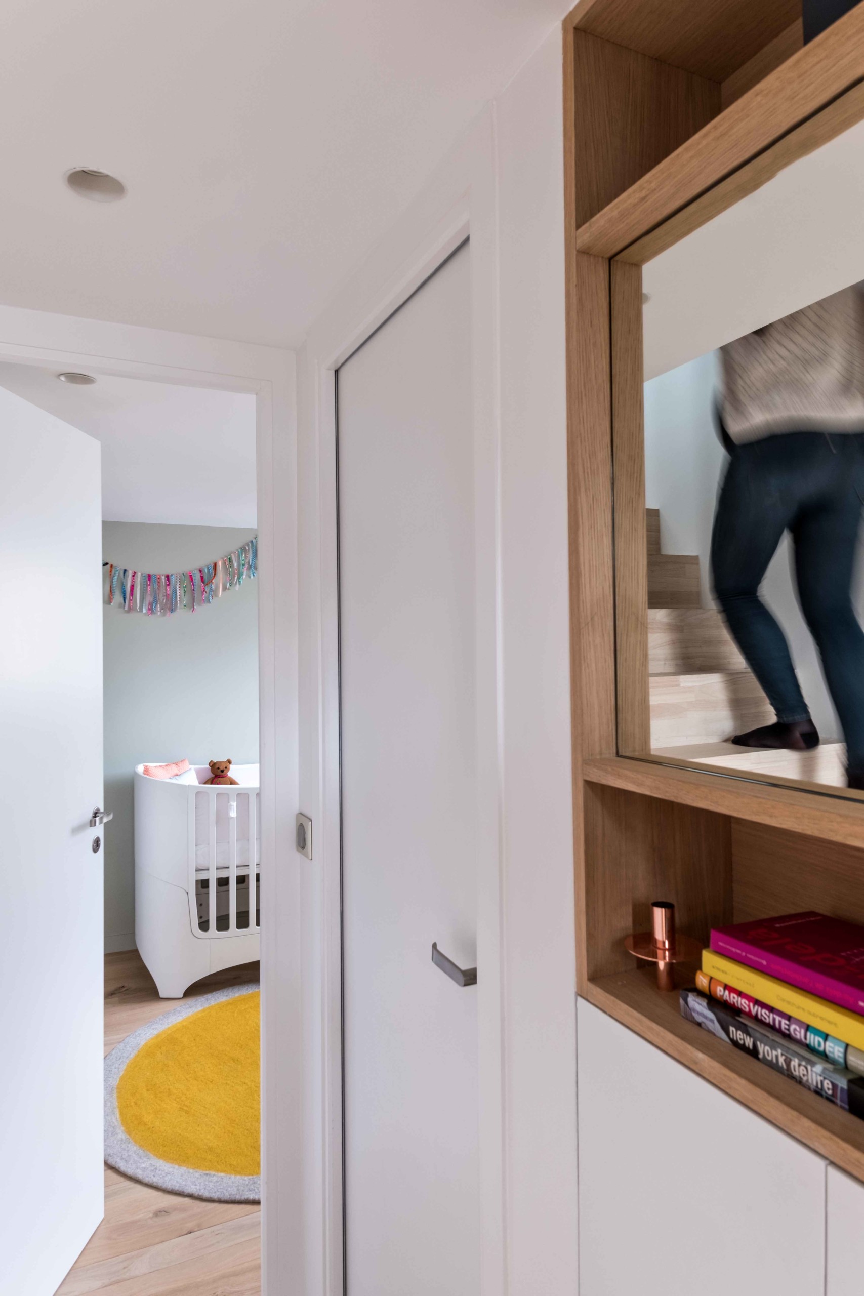 La chambre d’enfant est compacte mais pas dénuée de charme, associant le vert amande à un tapis rond jaune curry.