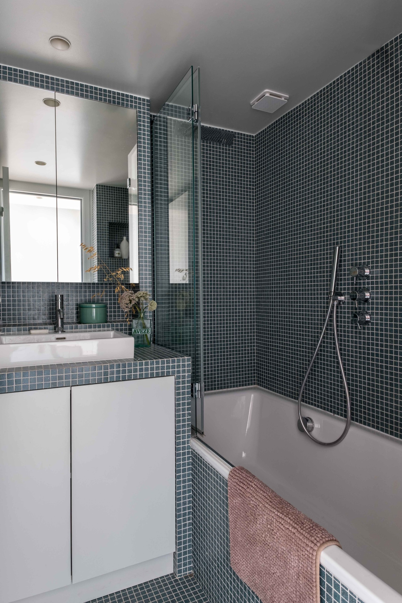 Le meuble vasque est recouvert de pâte de verre. Il a été maçonné sur mesure : la solution pour optimiser l’espace au millimètre près !