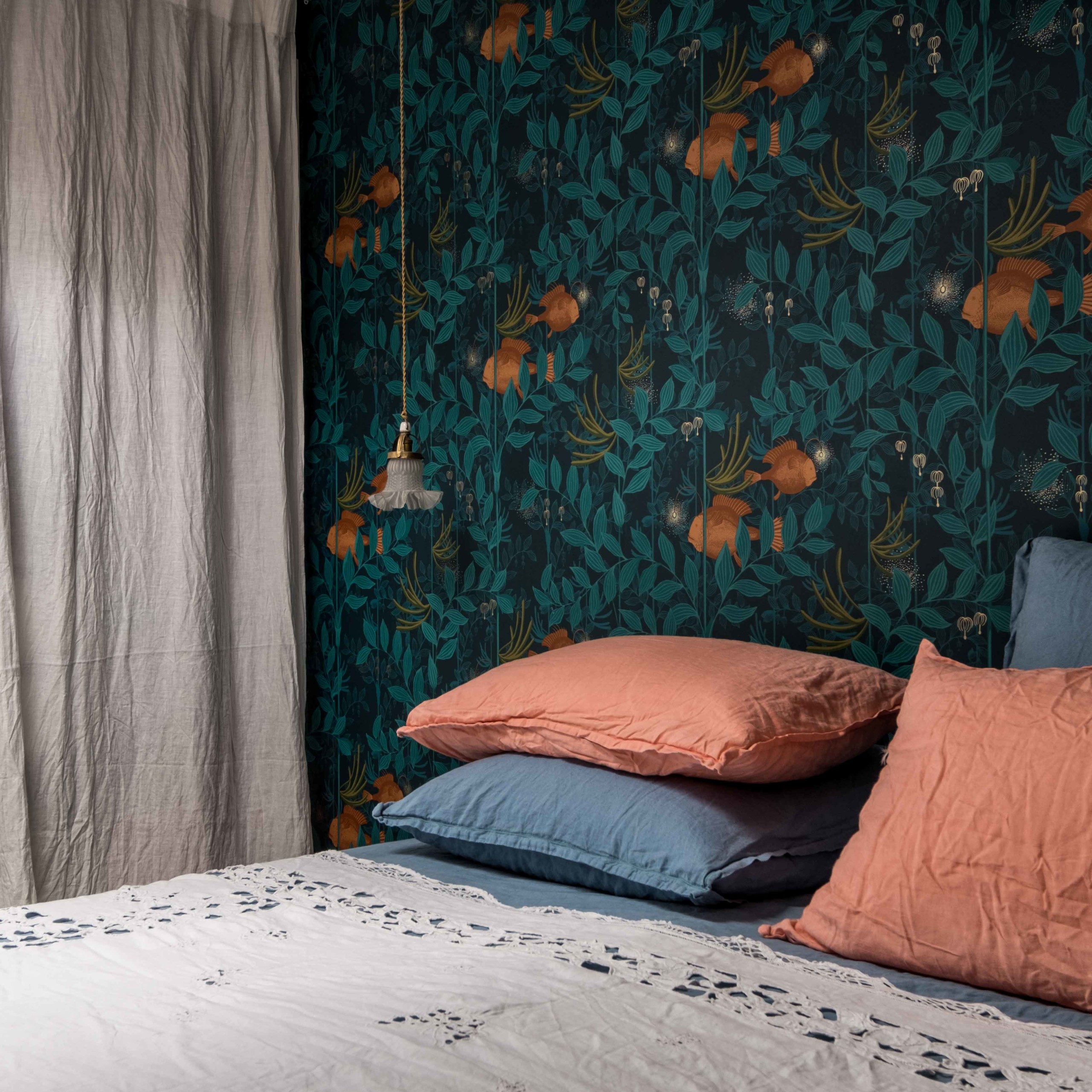 Dans les anciens combles, le papier-peint de la chambre incite à la rêverie en nous plongeant dans une ambiance aquatique !