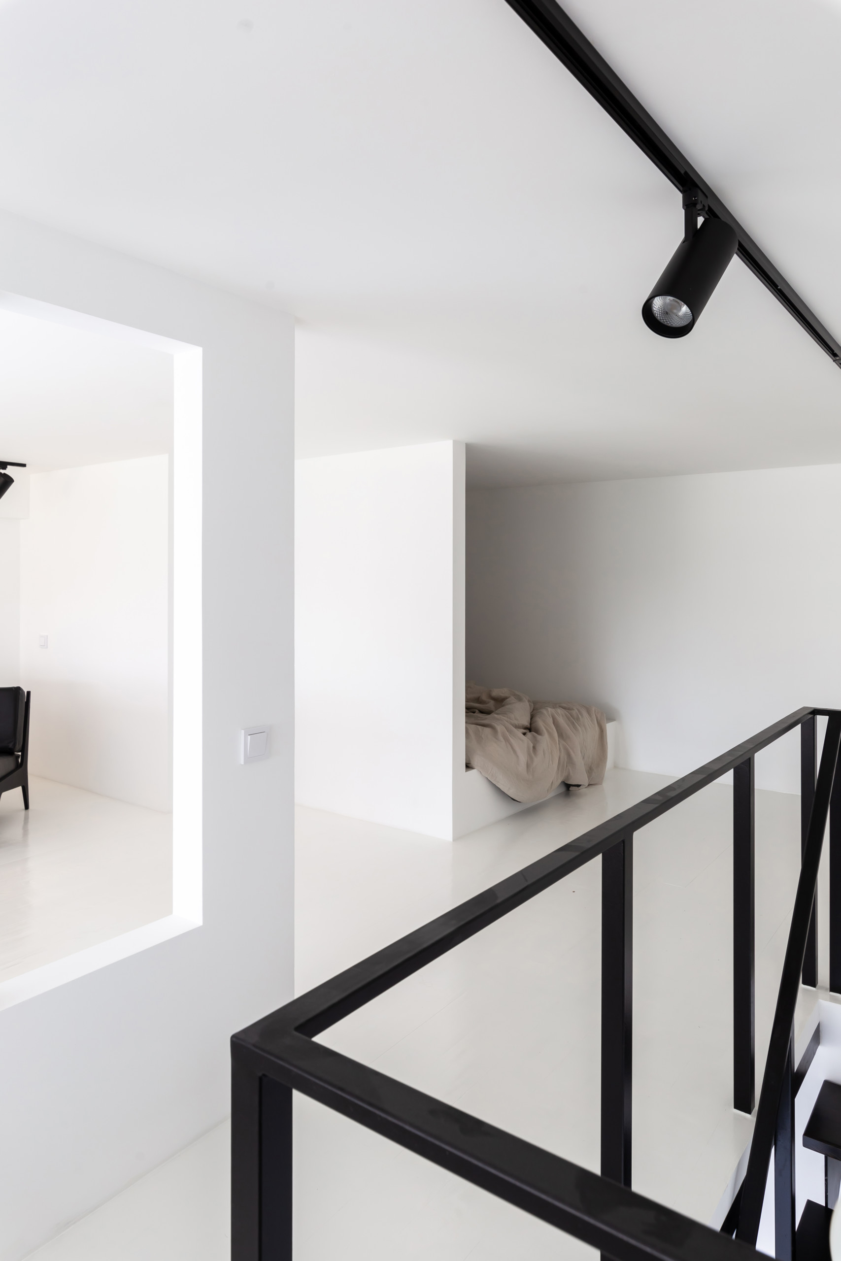 Le coin nuit a été pensé en accord avec l’esprit de l’appartement : minimal. Une simple cloison l’isole et occulte l’intense lumière.