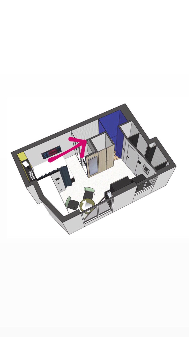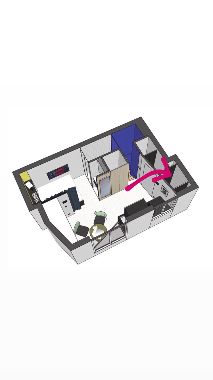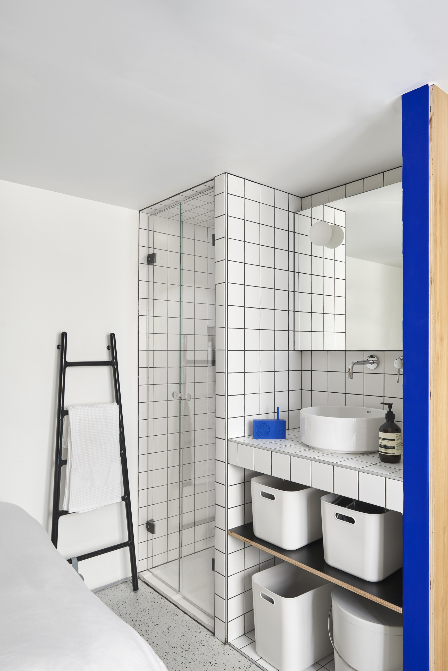 La couleur Klein IKB de chez Ressource fait de cette cage d’escalier une pièce à part entière qui assure la transition vers le studio. D’ailleurs, Yves Klein adorait les happenings. Avec ce cadre noir, vous ne serez pas déçu ! Attendez la suite.