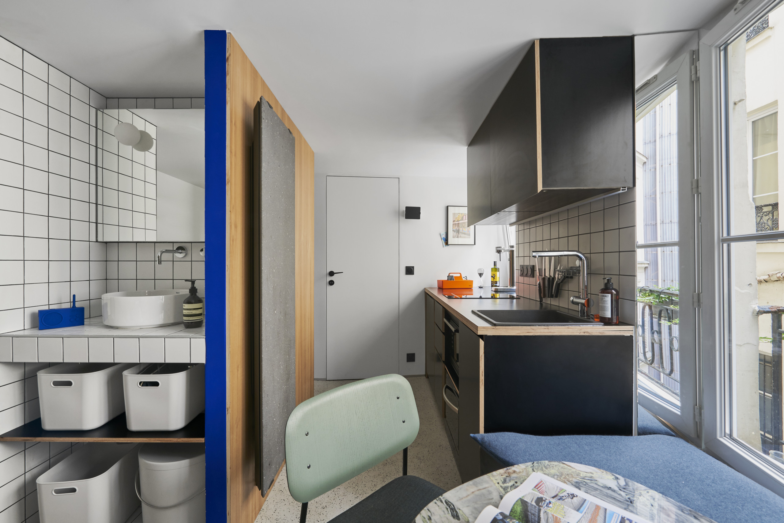 La pièce à vivre est ultra compacte, avec une élégante cuisine noire se prolongeant en petit espace de réception.