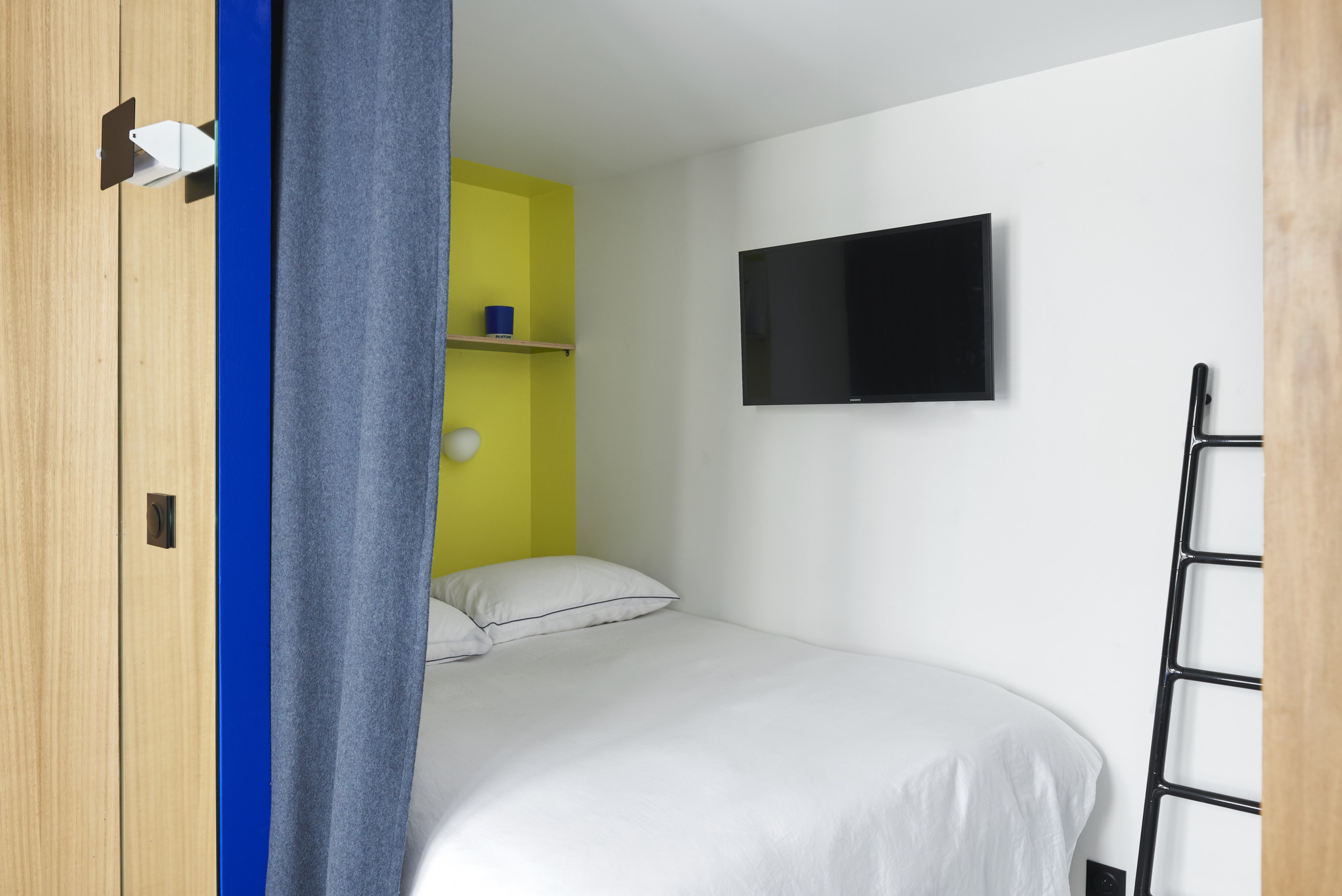 Sur la droite, un épais rideau occultant sépare le lit du séjour.