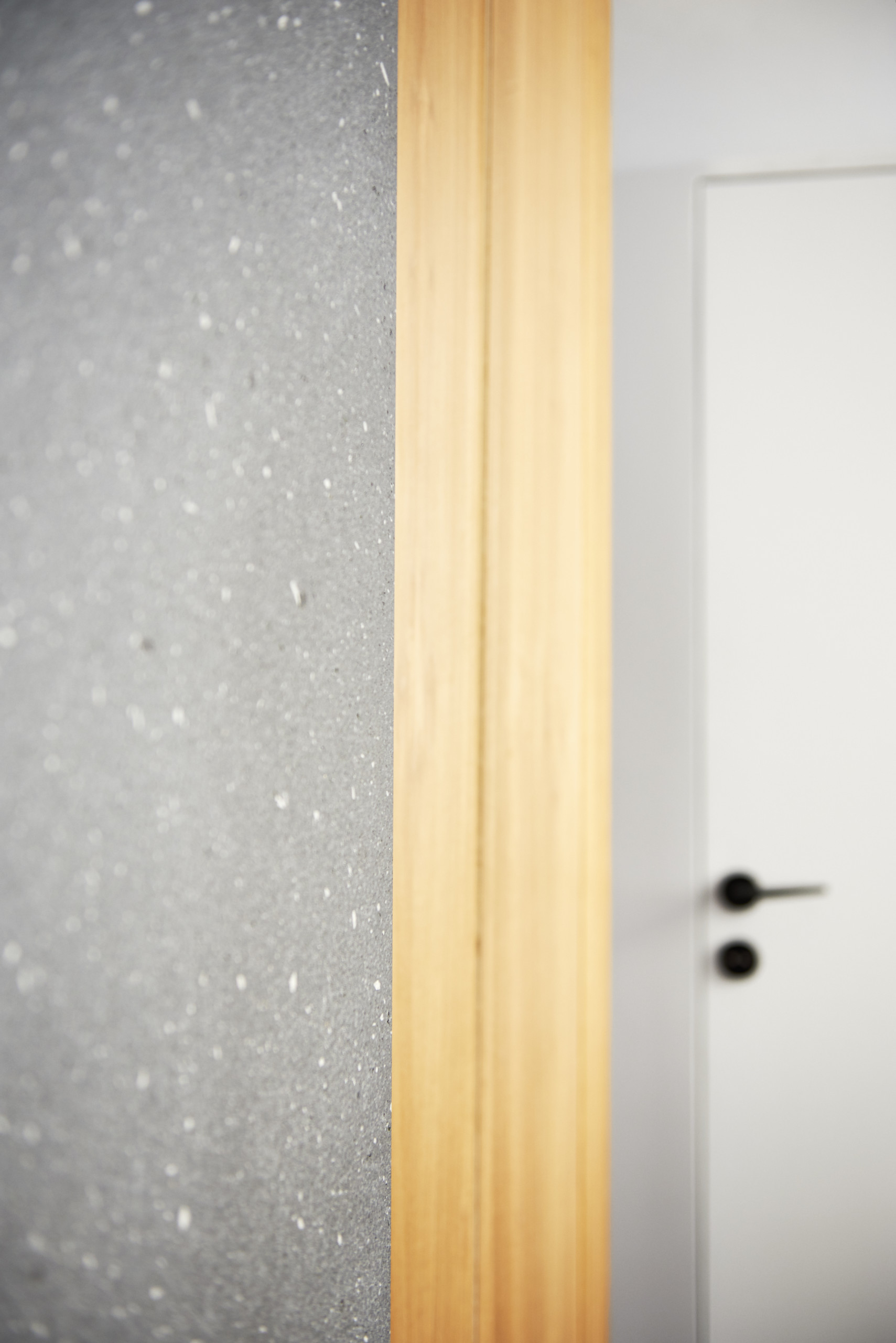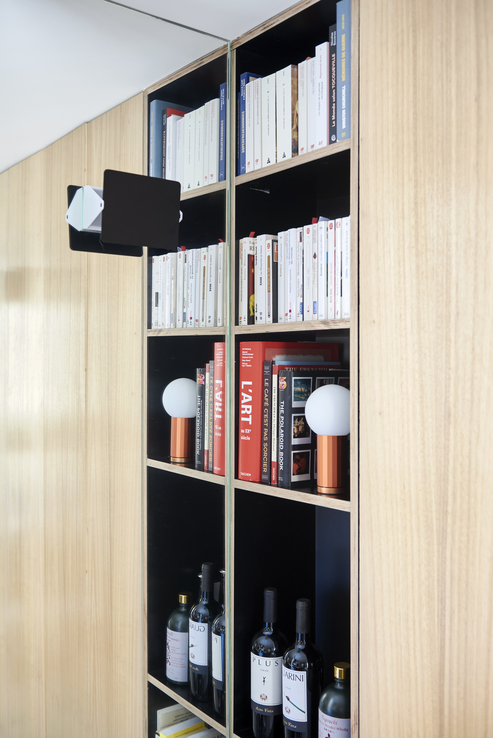 Bibliothèque Bois Carrelage Cuisine ouverte Miroir Mur coloré Terrazzo