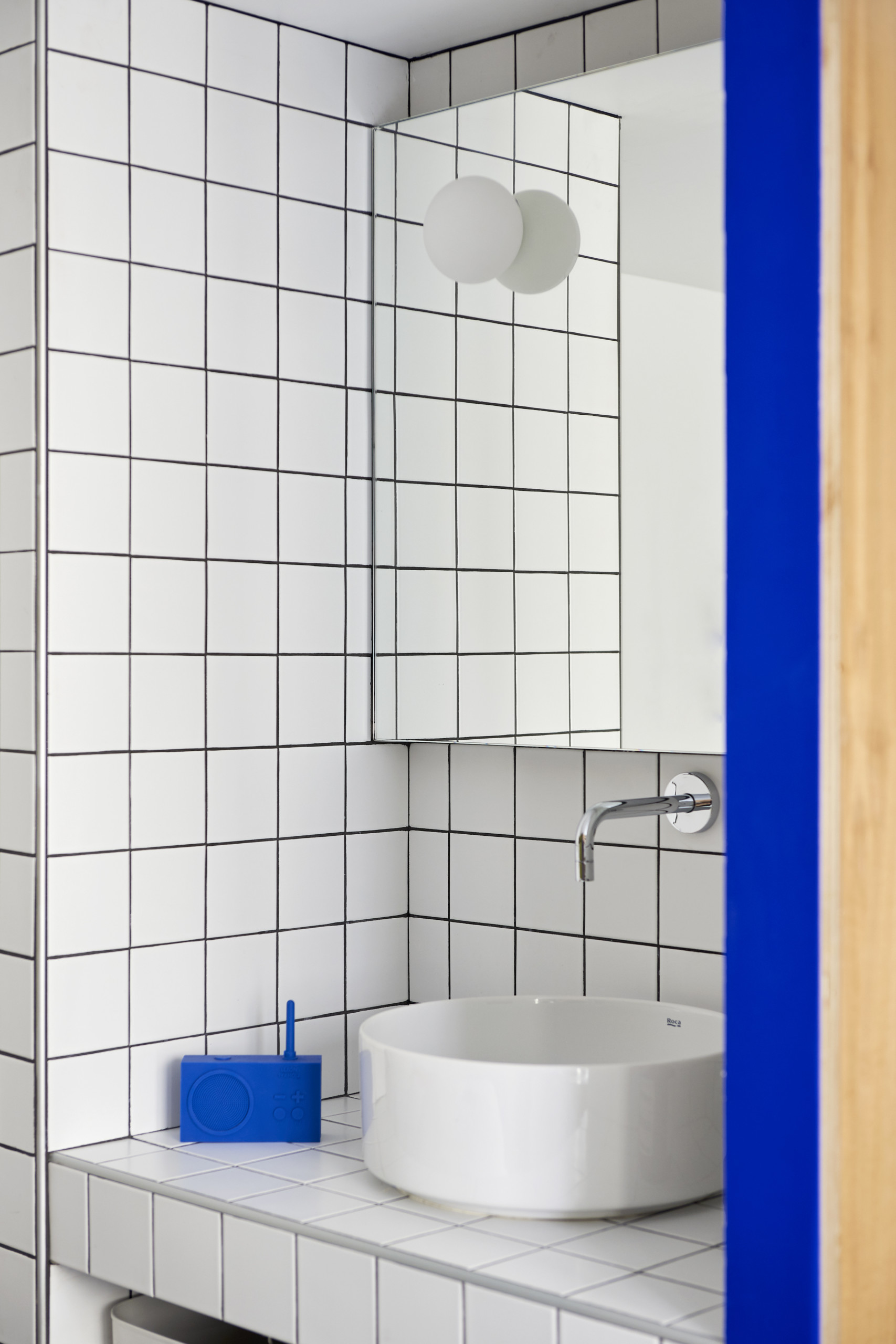 Face au lit, le lavabo, encadré par un carrelage en carrés blancs. La touche contemporaine se joue dans la couleur du joint, choisie noire !
