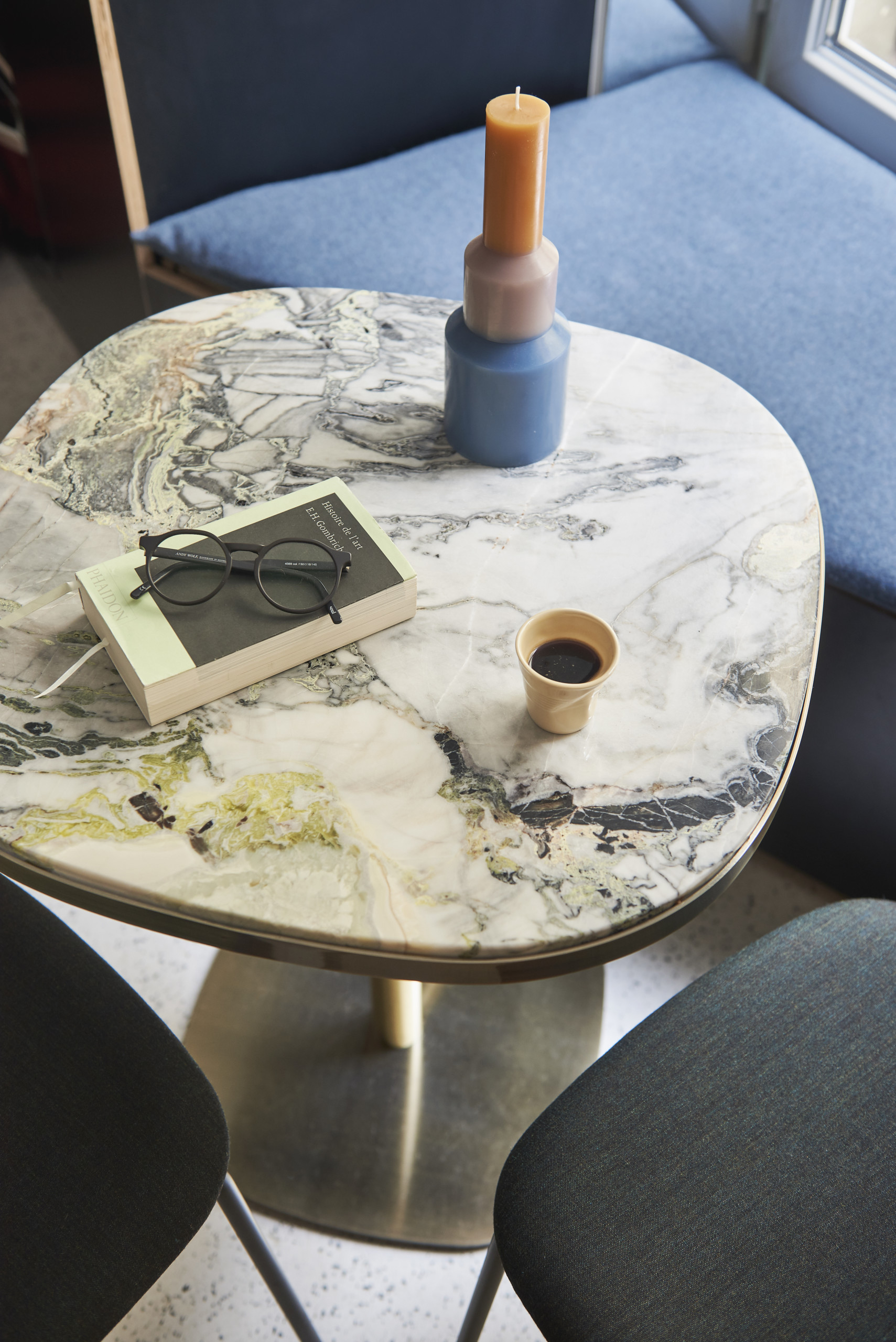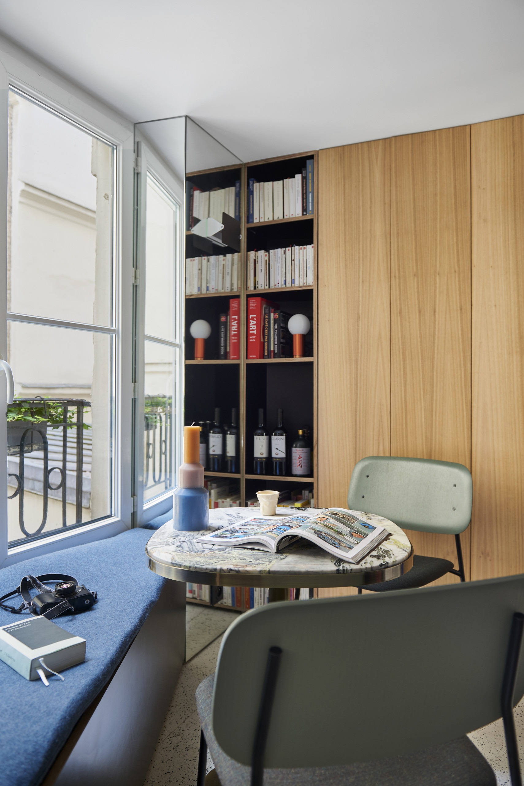 La table est installée face à la fenêtre. En dessous de cette dernière se trouve une banquette réalisée sur-mesure. On passe de 2 convives à 4, sans perdre de place !