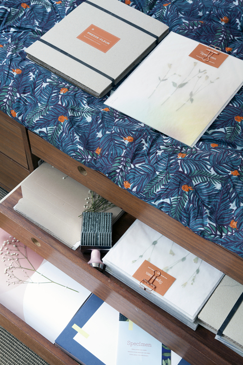 Lucie et Lola : Nous sommes toutes les deux directrices artistiques, donc on adore concevoir des produits. L’idée d’un kit complet s’est assez vite imposée avec un presse-fleur pour faire sécher les fleurs et l’herbier pour les classer. Il a fallu ensuite choisir les différents papiers, les encres, les couleurs… On a fait beaucoup de tests aussi, notamment pour le presse-fleur. À l’ancienne, avec des vis papillons ? Ou alors plus léger, plus simple avec de gros élastiques ? On a du se poser des centaines de questions… Un peu comme quand on refait un appart’ ! On se dit qu’on va refaire un espace, mais très vite, on se retrouve face à une multitude de questions auxquelles on n’a pas forcément pensé : quelles poignées de portes ? Quels interrupteurs ? Quelles plinthes ? etc. Ce sont des détails mais qui sont en fait fondamentaux dans l’aspect final du produit. Petit à petit on est arrivé à un prototype dont nous étions ravies. Ensuite il a fallu trouver le bon imprimeur et maintenant on en a 1 000 en stock !