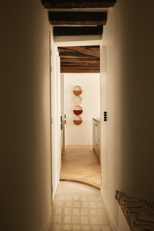 Dès l’entrée, le changement de sol — mosaïque Mosaic Factory puis parquet CarréSol Éditions — marque le premier seuil. Au fond, l’applique Wilo & Grove donne le ton : un vocabulaire de formes circulaires qui guidera toute la visite.