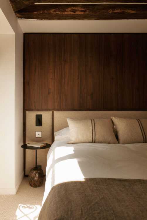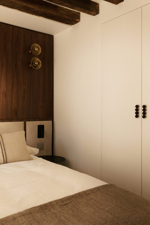 Dans la chambre, la tête de lit recouverte de teintes claires, conçue par Brian Altarac, crée un contraste saisissant avec le mur en bois sombre. L’applique liseuse Faro Barcelona ajoute une touche chaleureuse à cet espace. Le tout forme un cocon qui évoque l’ambiance d’un hôtel.