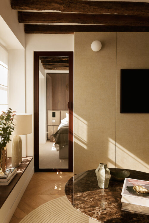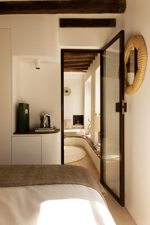 Une porte vitrée ouvre la perspective vers la chambre. En franchissant le seuil, la moquette La Maison Bineau remplace le parquet, instillant une atmosphère plus feutrée. La lumière naturelle, déjà très présente dans la pièce de vie, s’y prolonge presque sans rupture.