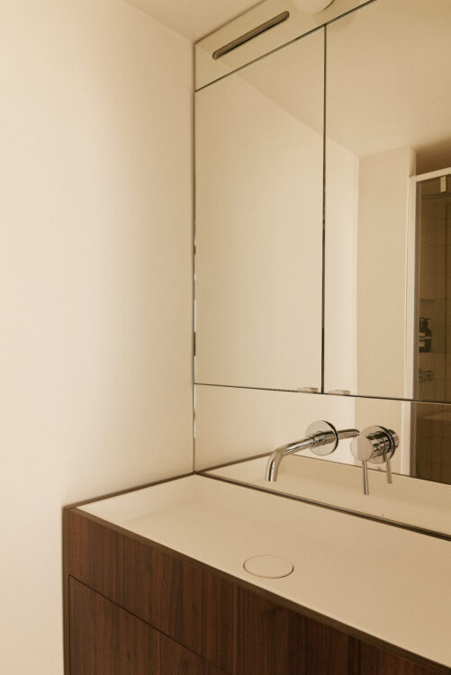 Dans la salle d’eau, la sobriété est de mise : rangements dissimulés derrière un miroir, meuble vasque en bois, finitions épurées…