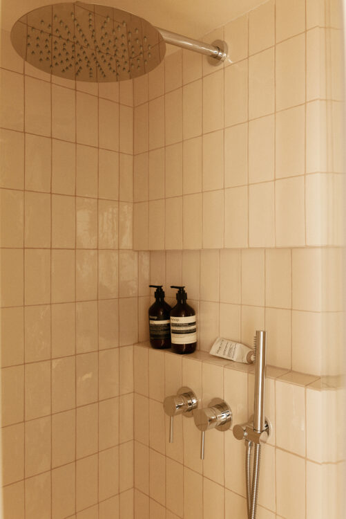 Niche aux angles arrondis, robinetterie courbe… La douche invite à la douceur, dans la même logique de fluidité que le reste de l’appartement.
