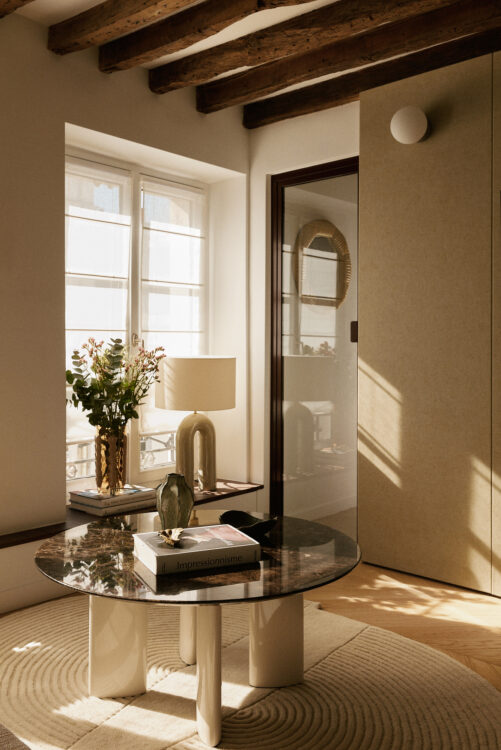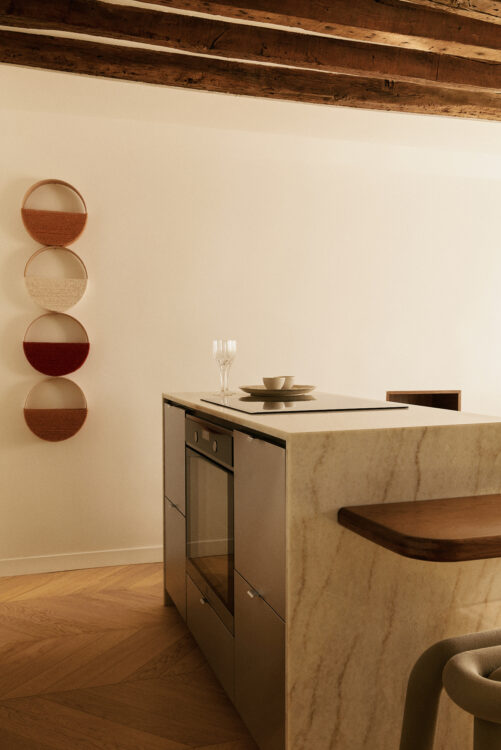 Recouvert d’un plan de travail en marbre Easy Plan sur mesure, l’îlot regroupe les fonctions techniques — four, rangements, plaque à induction — tout en conservant une présence sculpturale. Compact mais généreux, il articule la circulation entre entrée, cuisine et salon.