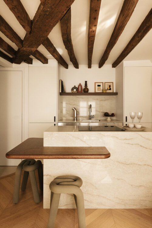 Côté séjour, un bar en bois s’avance en porte-à-faux depuis l’îlot en marbre. Deux tabourets de Moustache Éditions ajoutent une touche de design.