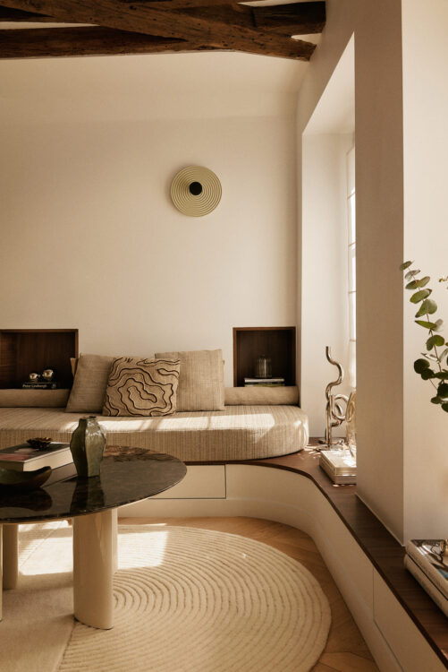 Côté salon, une banquette sur mesure, tapissée par Brian Altarac et habillée d’un tissu Villa Nova, court sur deux murs et rassemble plusieurs usages : assise, rangement, étagère basse et console sous fenêtres. L’applique Wever & Ducré et deux niches en bois rythment l’ensemble.