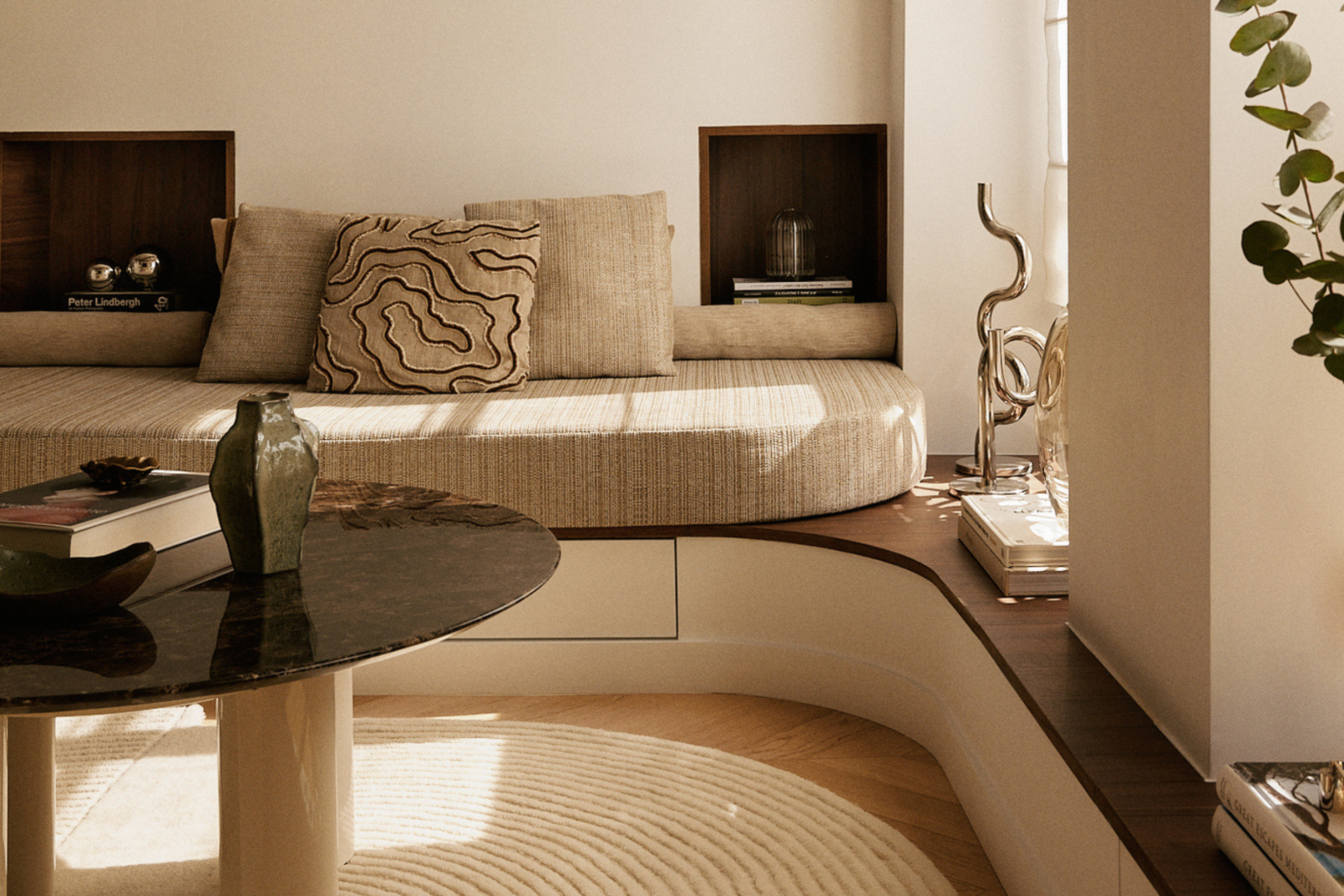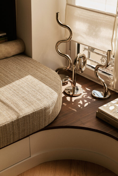 L’angle de la banquette est adouci par un coussin d’assise arrondi. Sous les fenêtres, elle se transforme en console basse, créant un ruban continu qui accompagne le regard.