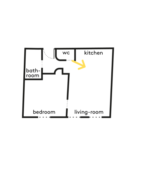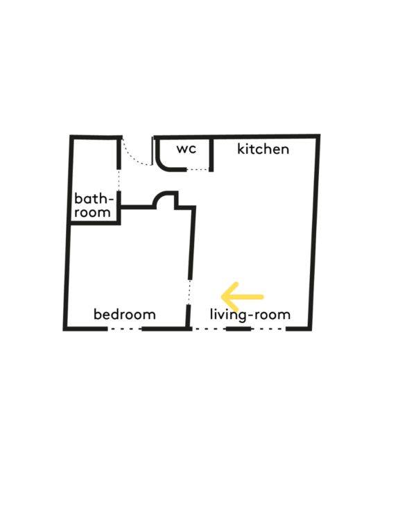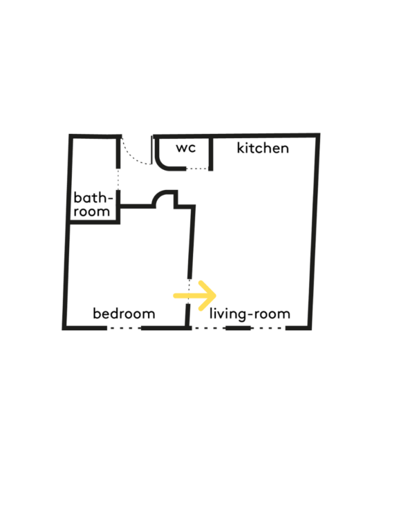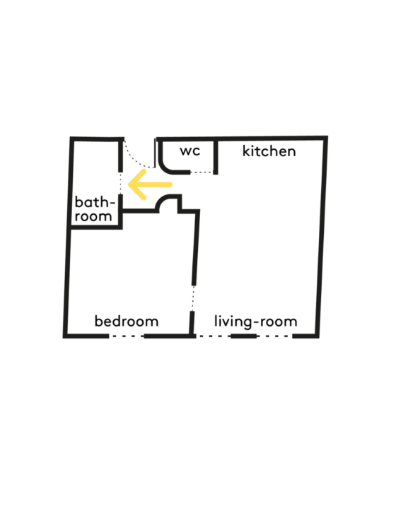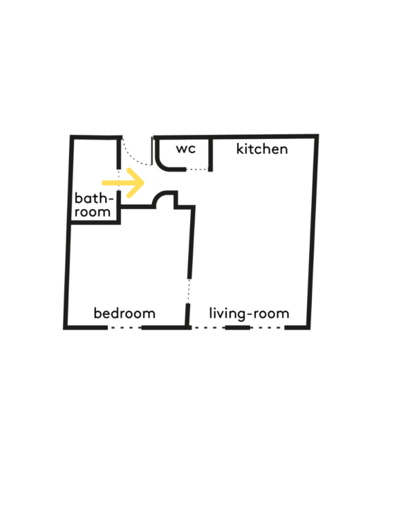 De retour vers l’entrée, un large miroir placé derrière une banquette étire les proportions de la pièce. Le sol en mosaïque, identique entre l’entrée et la salle d’eau, renforce la lecture continue des espaces. La porte à galandage s’inscrit dans une ouverture en forme d’arche.