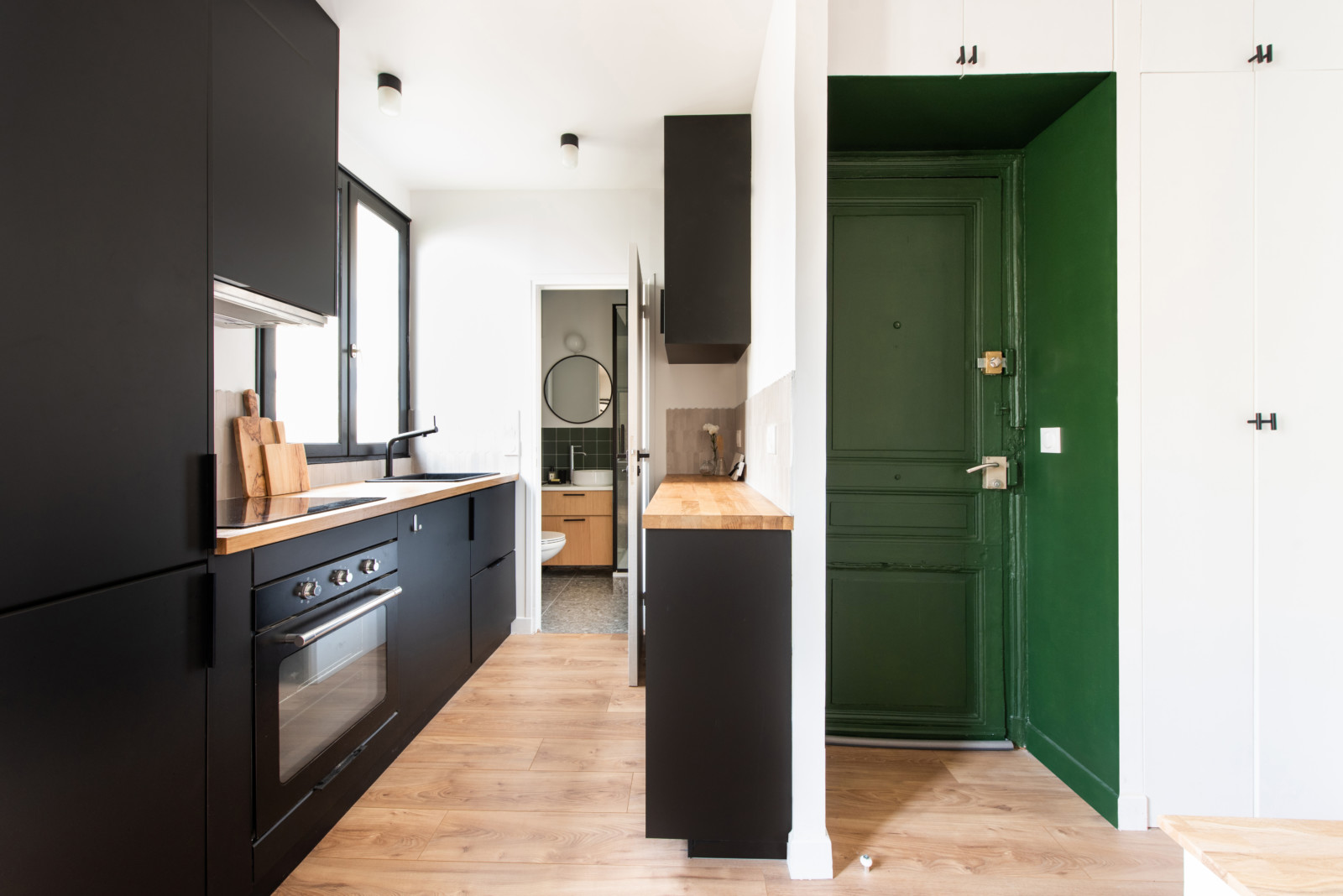 En face de la chambre, la cuisine se déploie en couloir. Un beau contraste se fait entre la cuisine choisie noire et la peinture verte qui habille l’entrée.