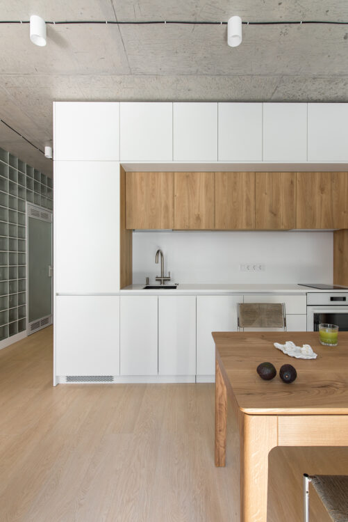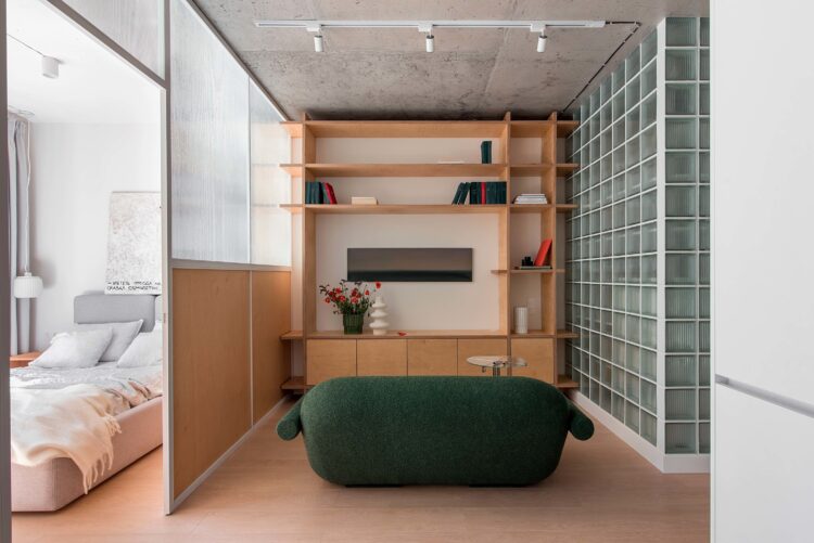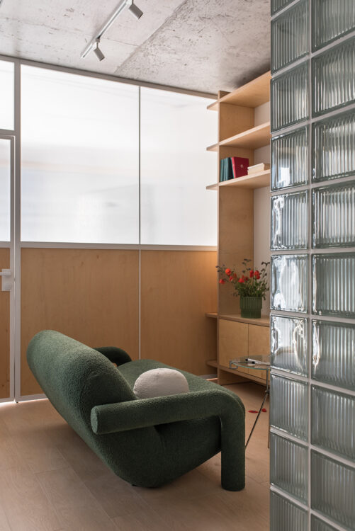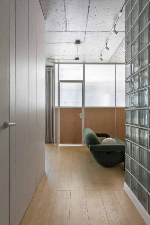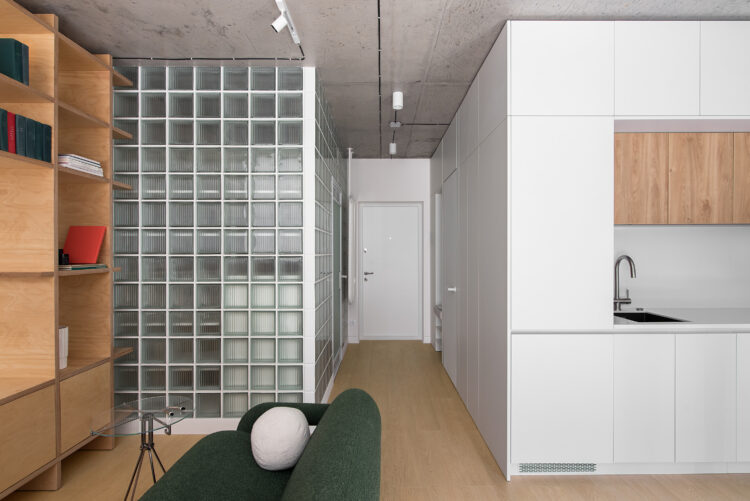 Dès l’entrée, la lumière glisse à travers les parois translucides pour rejoindre le cœur du logement. Le sol en chêne clair guide le regard vers le salon, tandis qu’un mur en pavés de verre structure la perspective et capte la lumière en fragments.