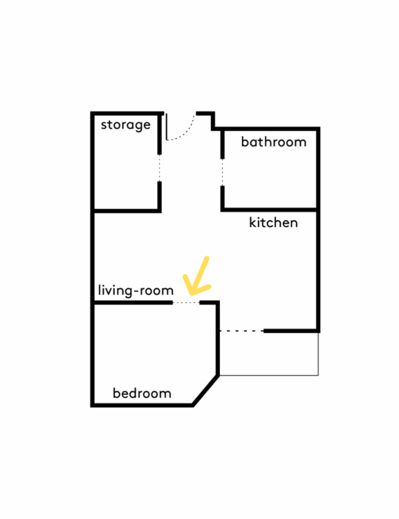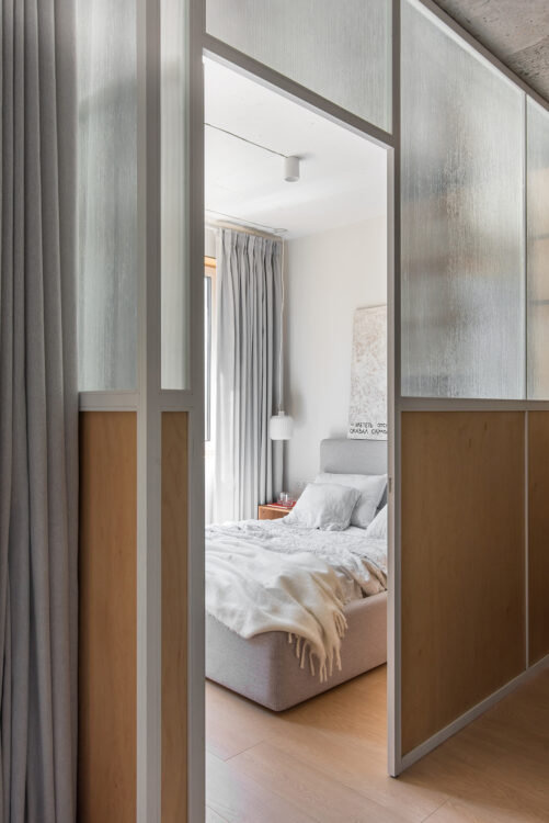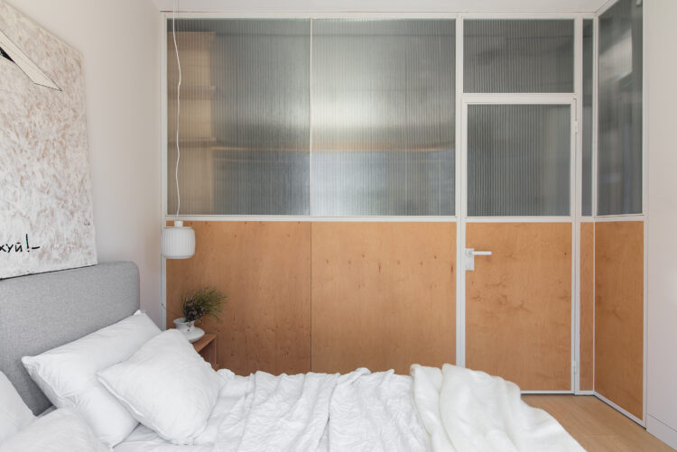 Depuis le séjour, la chambre se devine derrière une paroi de contreplaqué et de verre nervuré. Ce filtre semi-transparent laisse passer la lumière tout en préservant l’intimité.