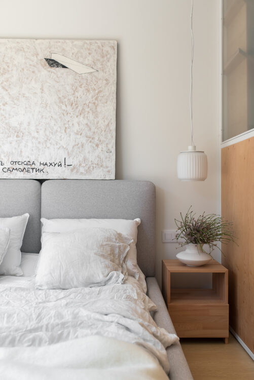 Les tons neutres enveloppent le regard, tandis que les lampes de chevet AM.PM introduisent un jeu de verticalité.