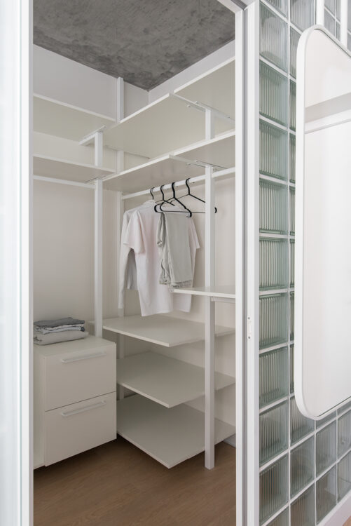 Derrière, un volume blanc dévoile des rangements à la géométrie calme, pensés pour la vie quotidienne.