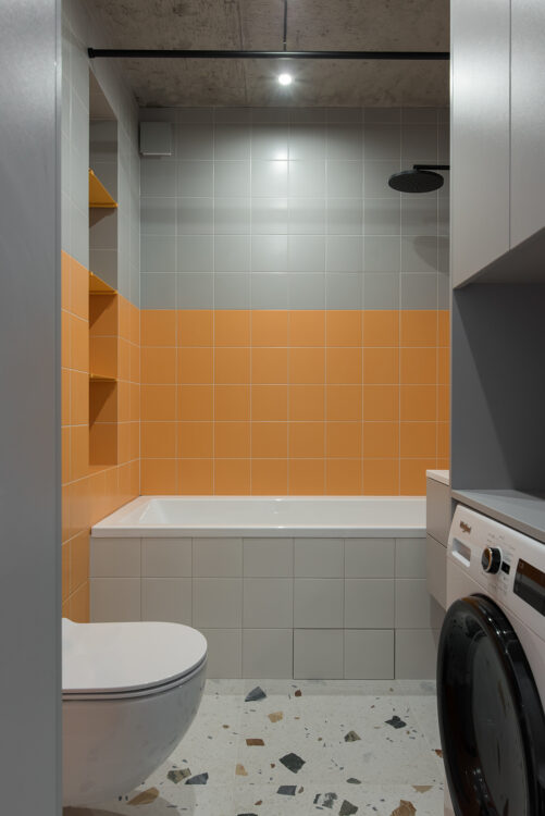 Face au dressing, la salle de bains joue la surprise. La faïence gris clair dialogue avec un orange franc, créant un contraste graphique sur fond de terrazzo XXL.