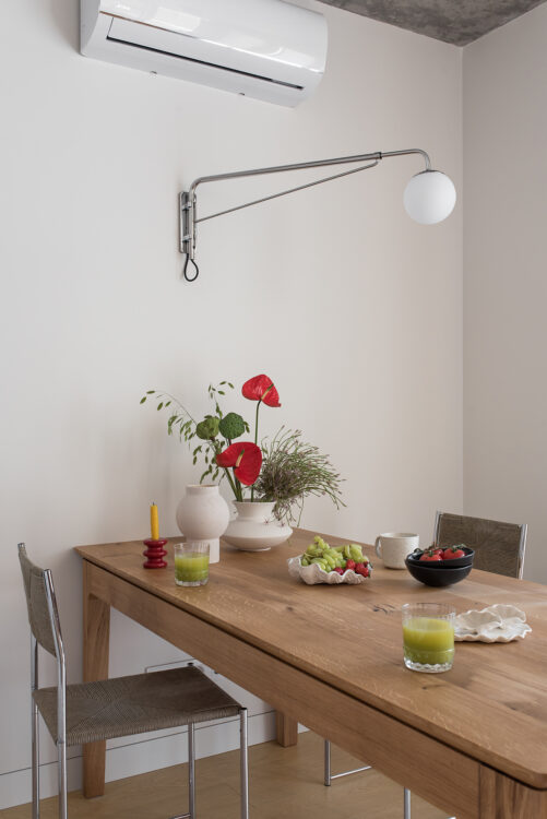 Au-dessus de la table, une applique déportée à l’esprit loft ponctue l’ensemble avec légèreté.