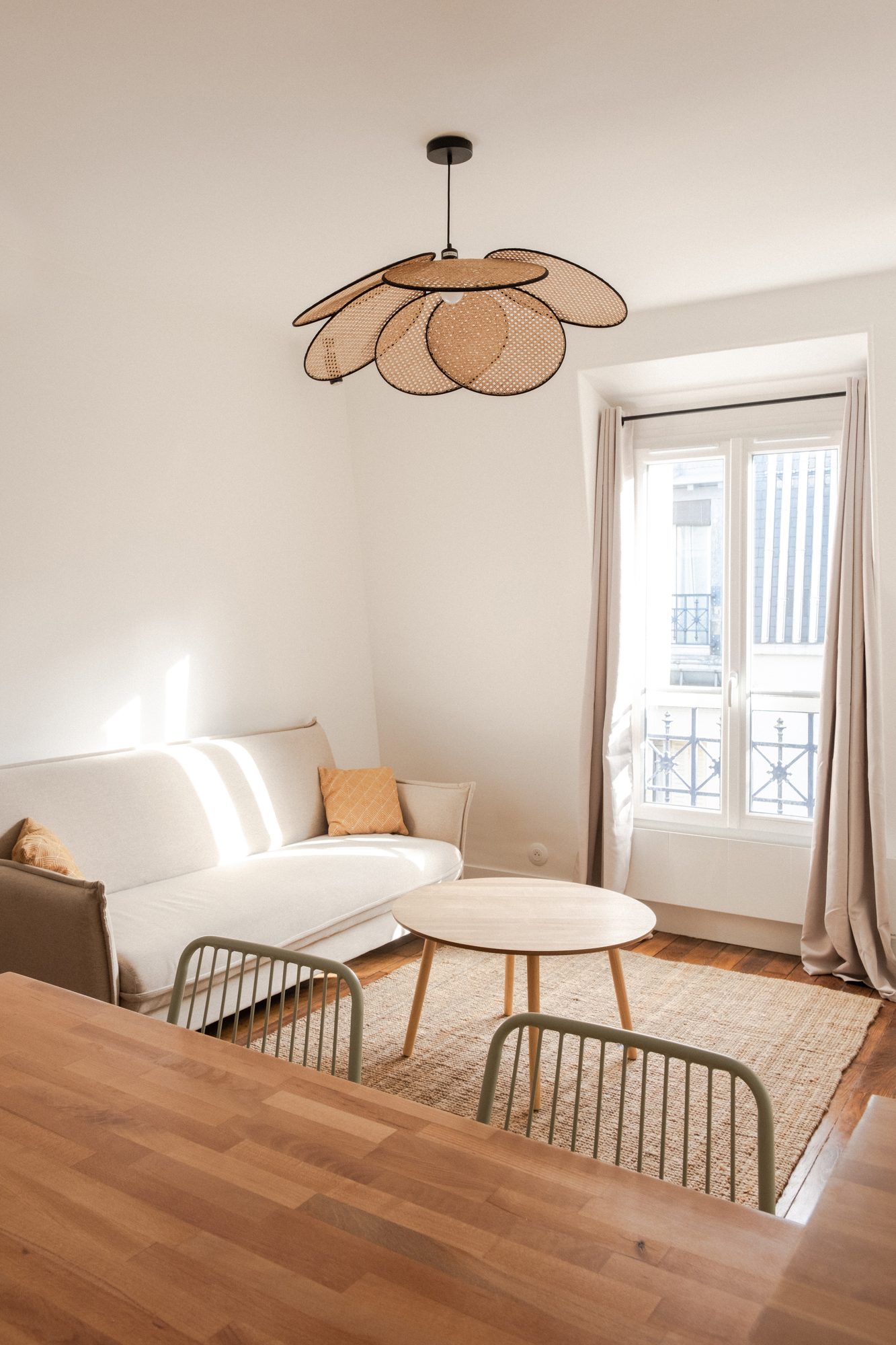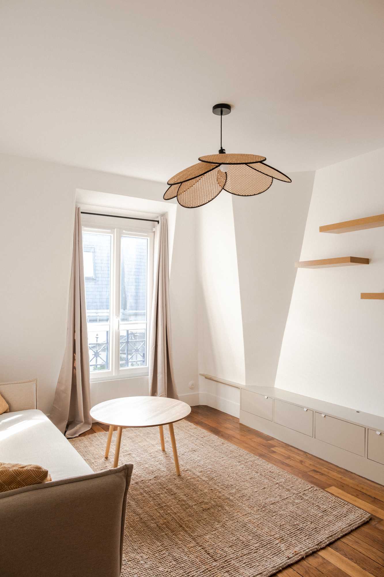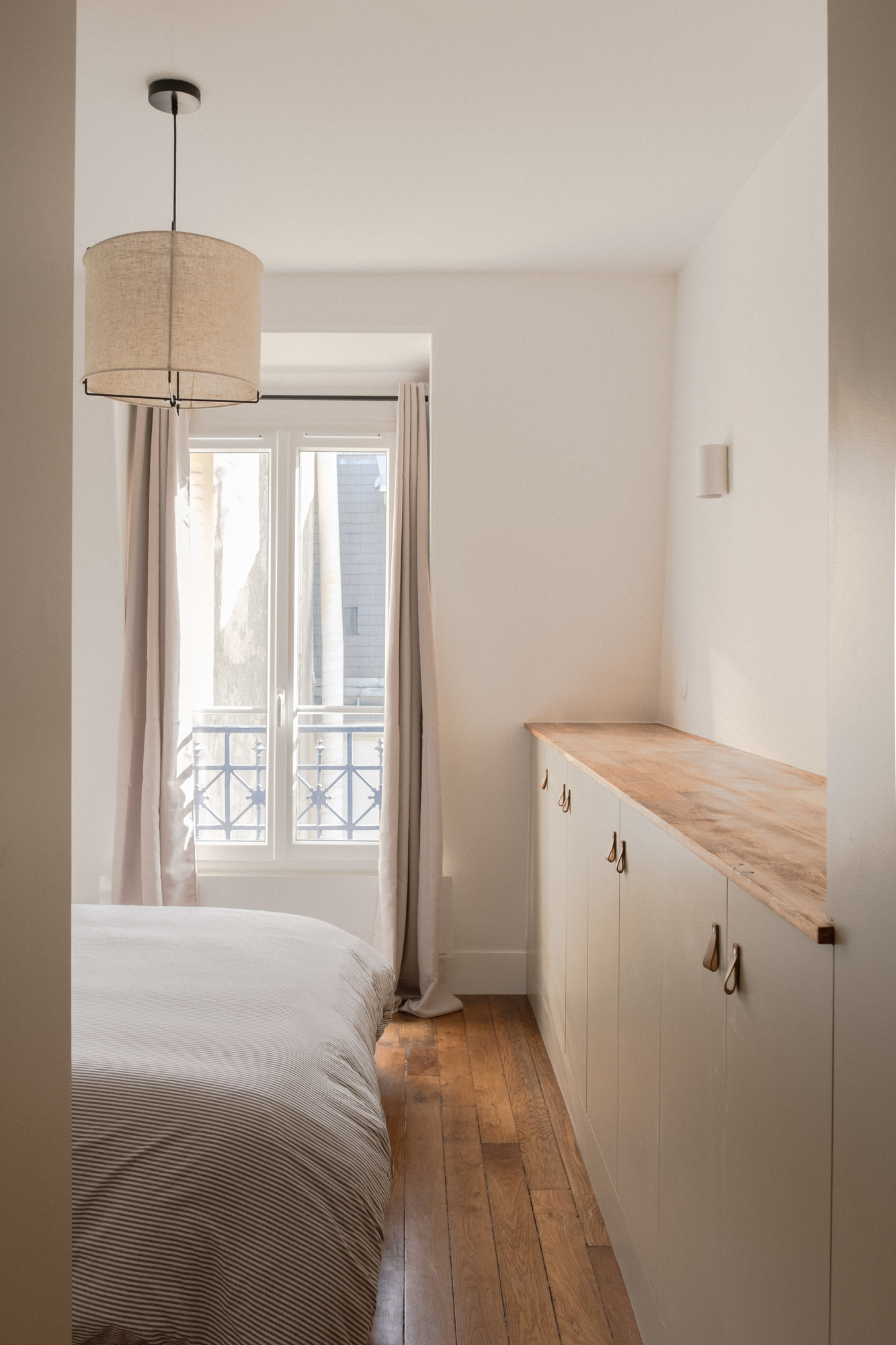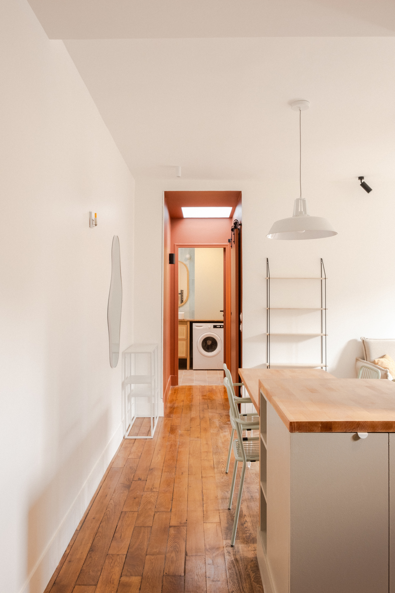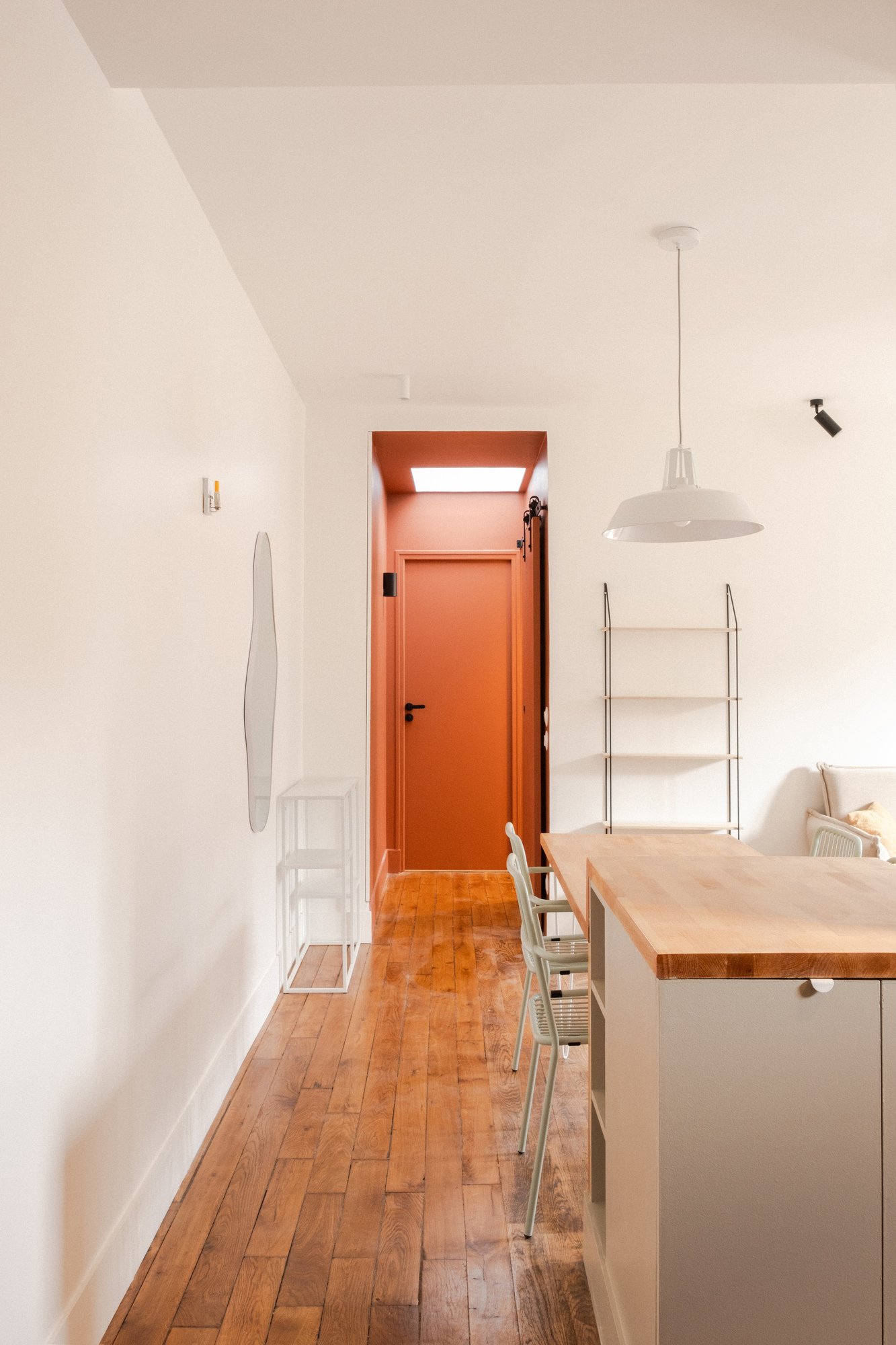 Difficile d’imaginer se trouver dans un espace autrefois occupé par deux chambres de bonnes et de W.-C. sur palier ! En intégrant aussi le couloir des parties communes, cet agréable T2 unifie les surfaces avec brio. Seul clin d’œil à une ancienne séparation : une peinture couleur brique habille le sas opposé à la porte d’entrée.
