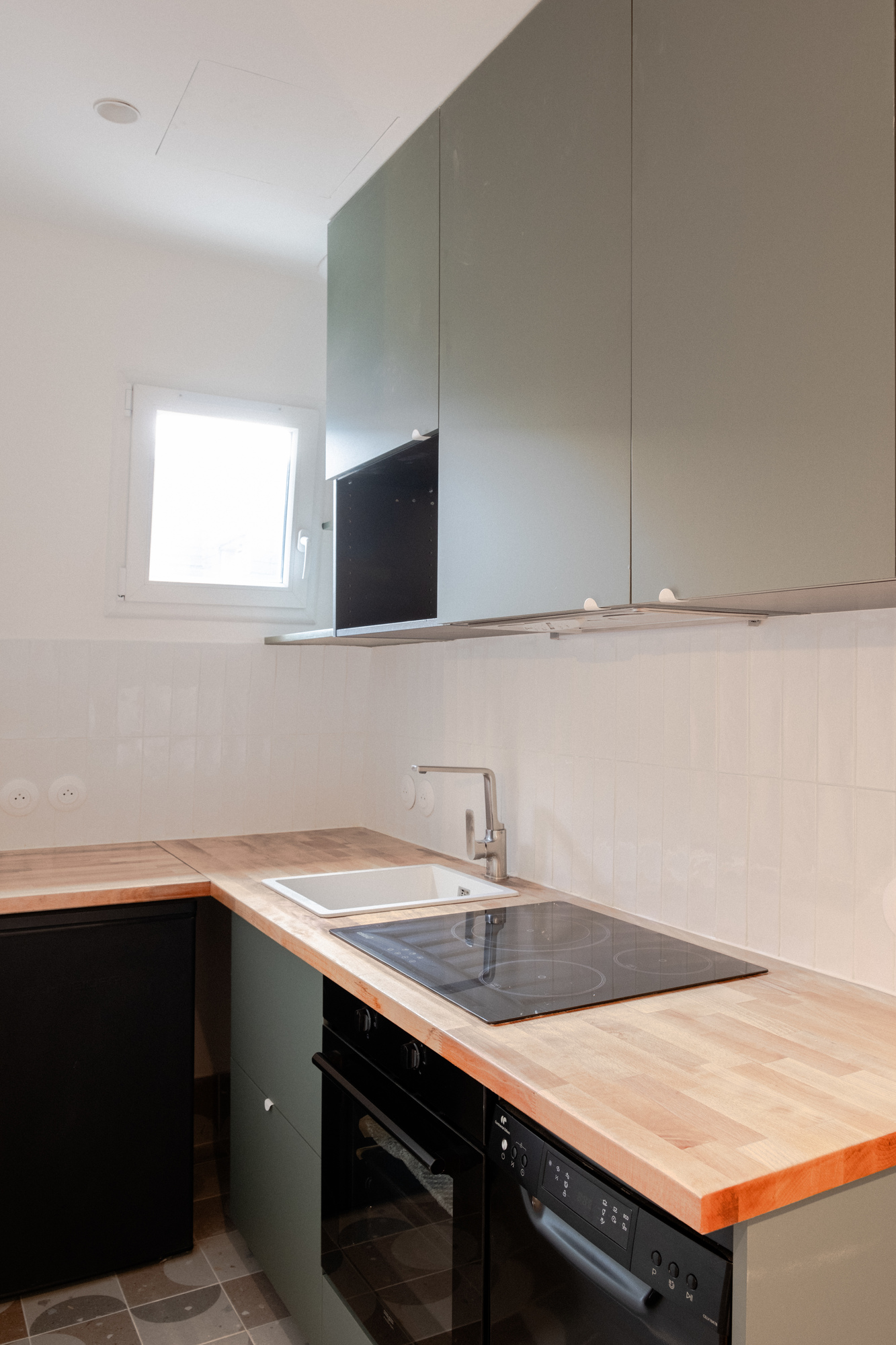 Simple mais efficace, la cuisine toute équipée arbore un style minimaliste chaleureux, rehaussé par un carrelage graphique au sol.