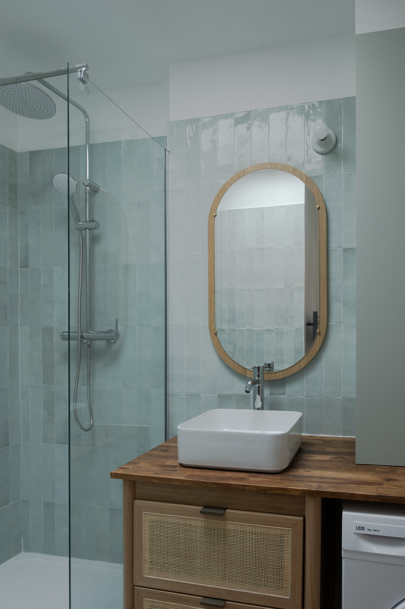 Écho au carré de ciel aperçu depuis le sas, la salle d’eau se pare de carreaux azur lumineux.