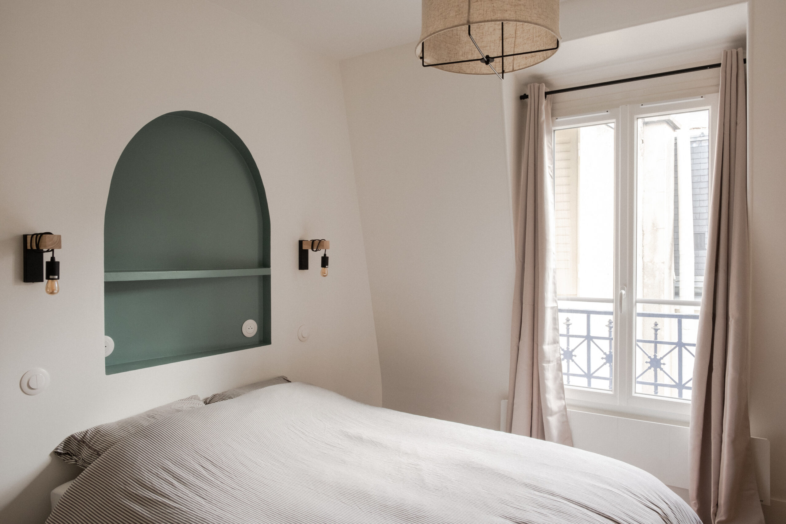 En plus d’ajouter un détail architectural atypique, une alcôve complétée d’une étagère permet de se passer de tables de nuit, libérant ainsi assez d’espace pour un large dressing.