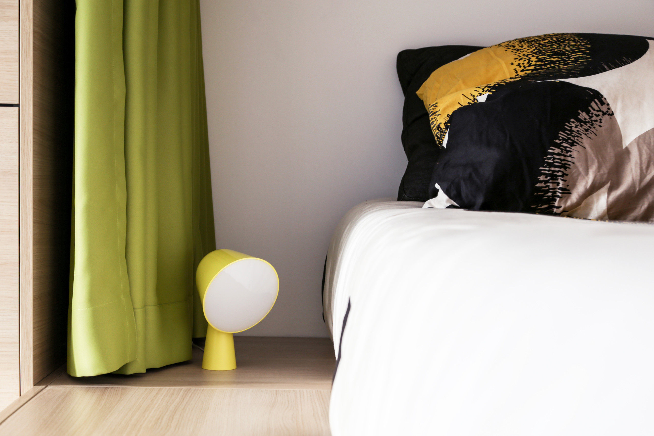 Alcôve Balcon Béton ciré Bois Carrelage Cuisine ouverte Mur coloré Rideau
