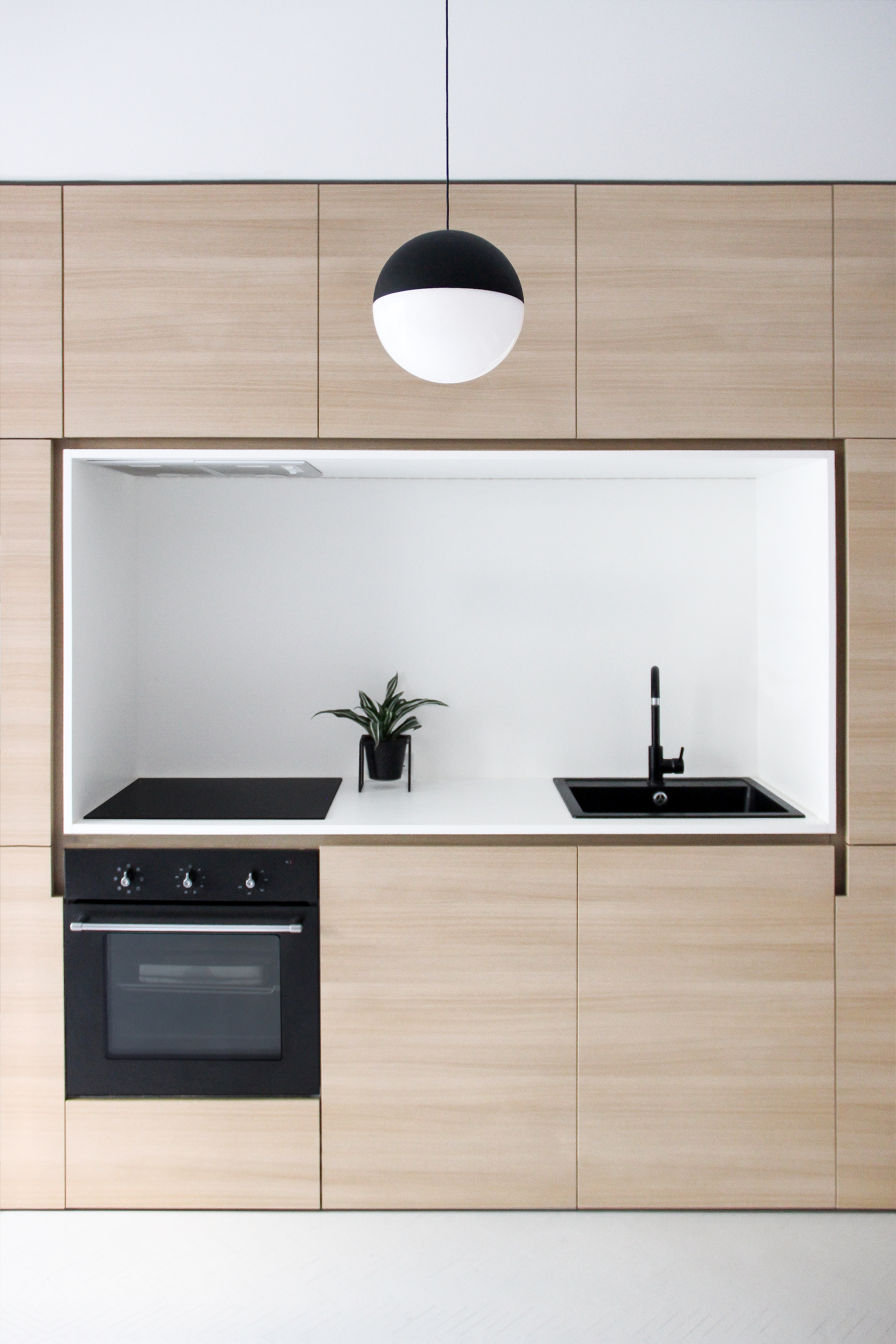 La cuisine, dans les tons de noir, blanc et bois clair, est minimale et très fonctionnelle.