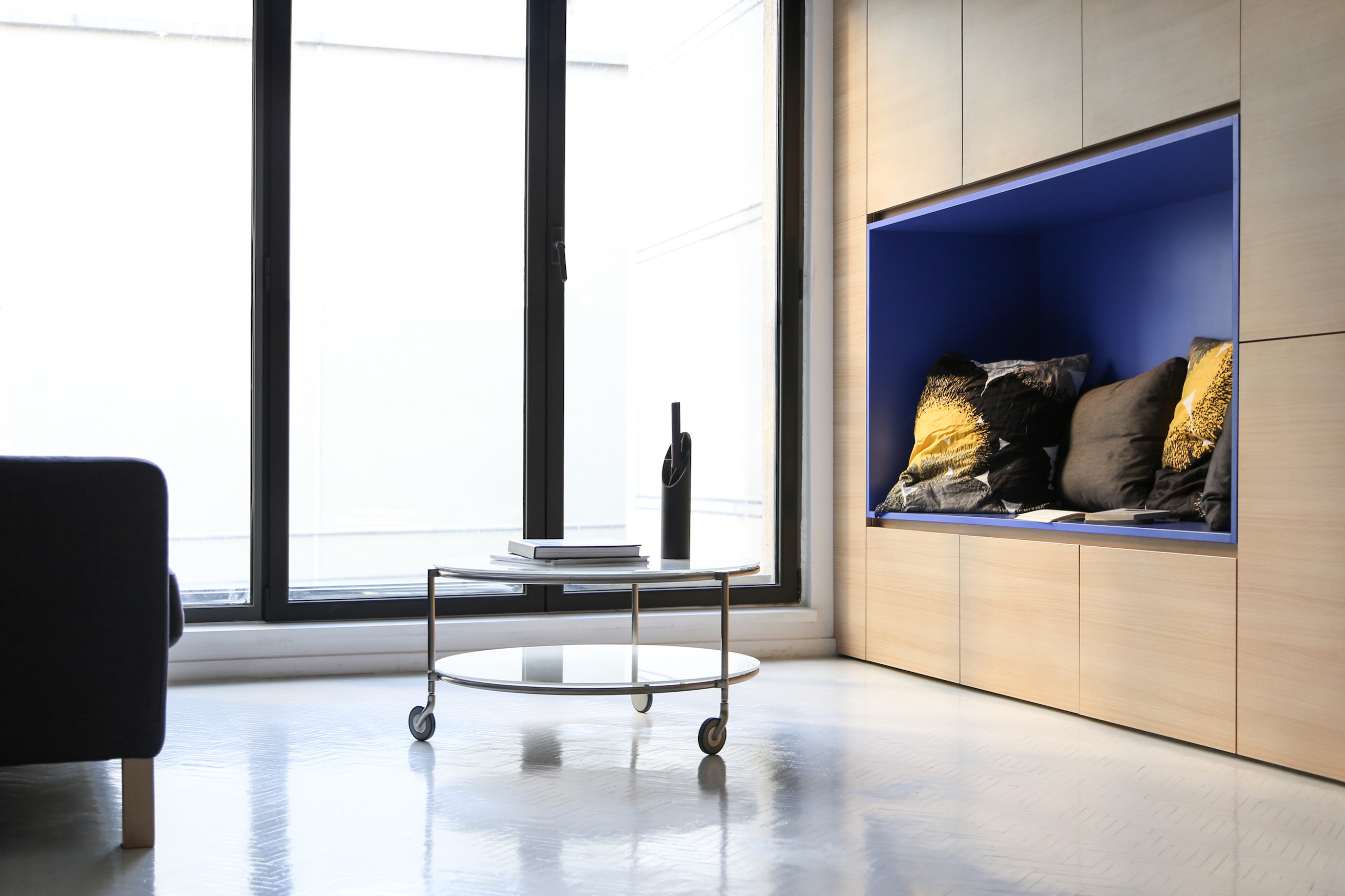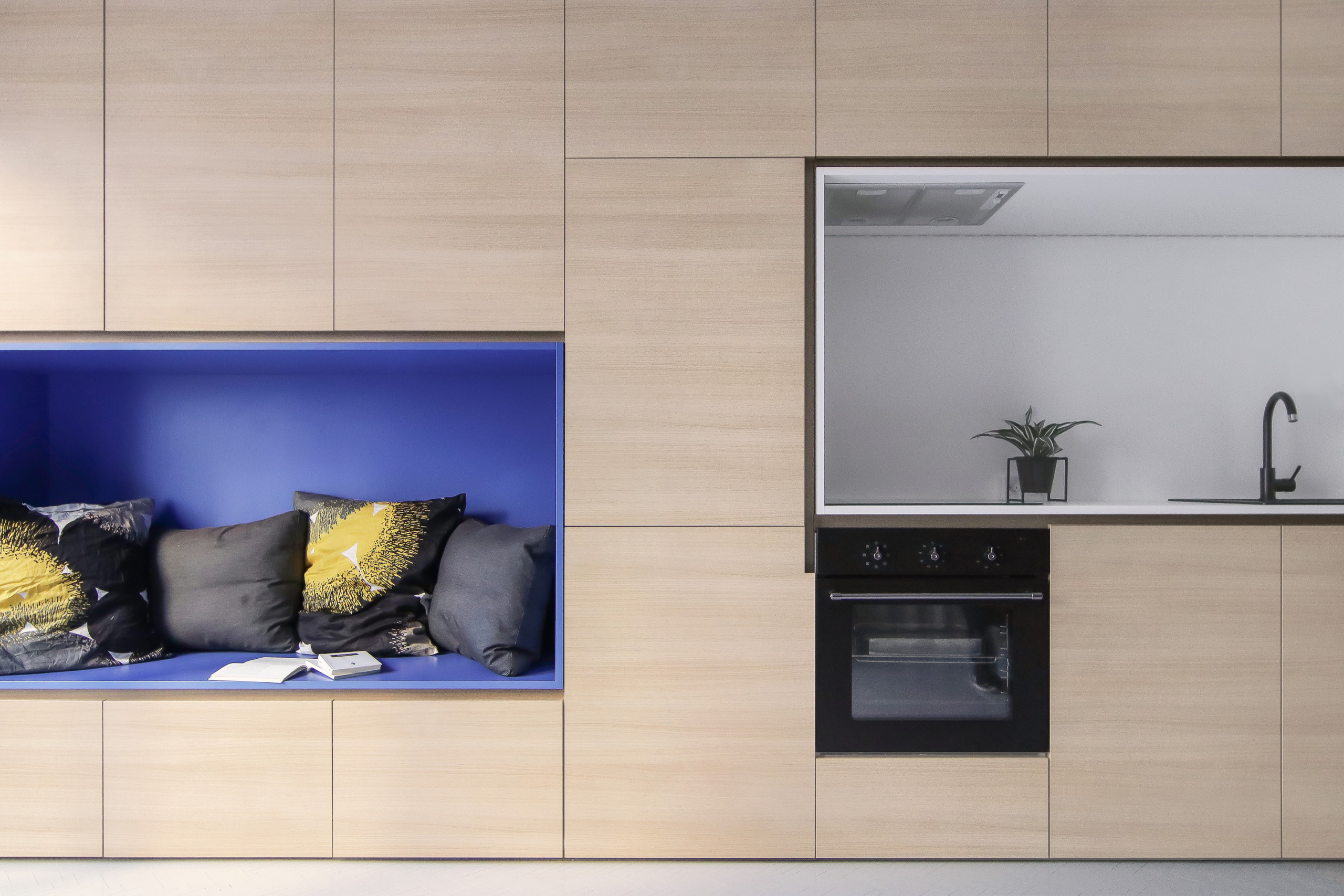 La cuisine se prolonge vers une alcôve peinte en bleue. Encadrée de placards dissimulés, elle sert d’assise à l’espace séjour.