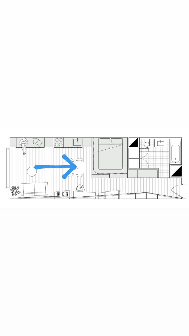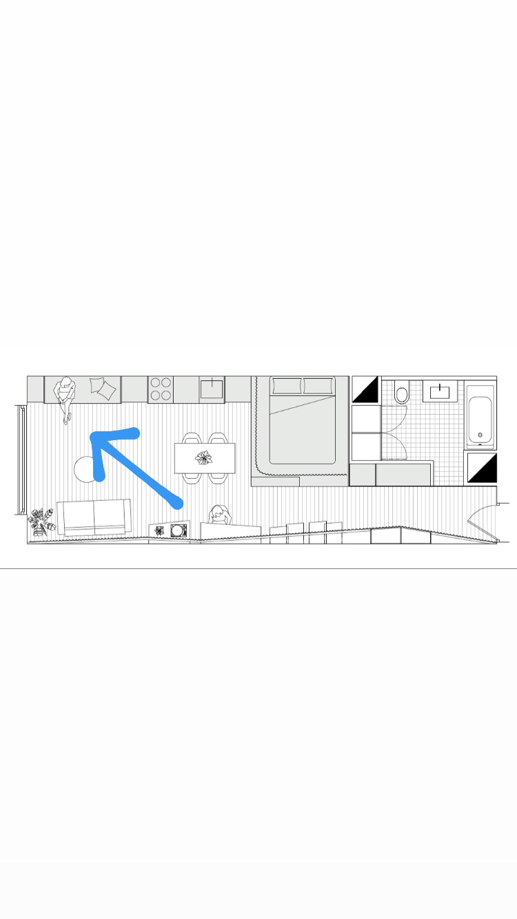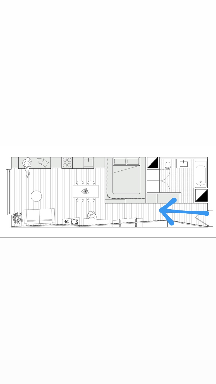 Voici la vue depuis l’unique baie de l’appartement. L’espace se dessine grâce à deux structures se faisant face. D’un côté, un module en bois clair sur lesquels se succèdent les fonctions de vie. De l’autre, une cloison ondulée en plastique.