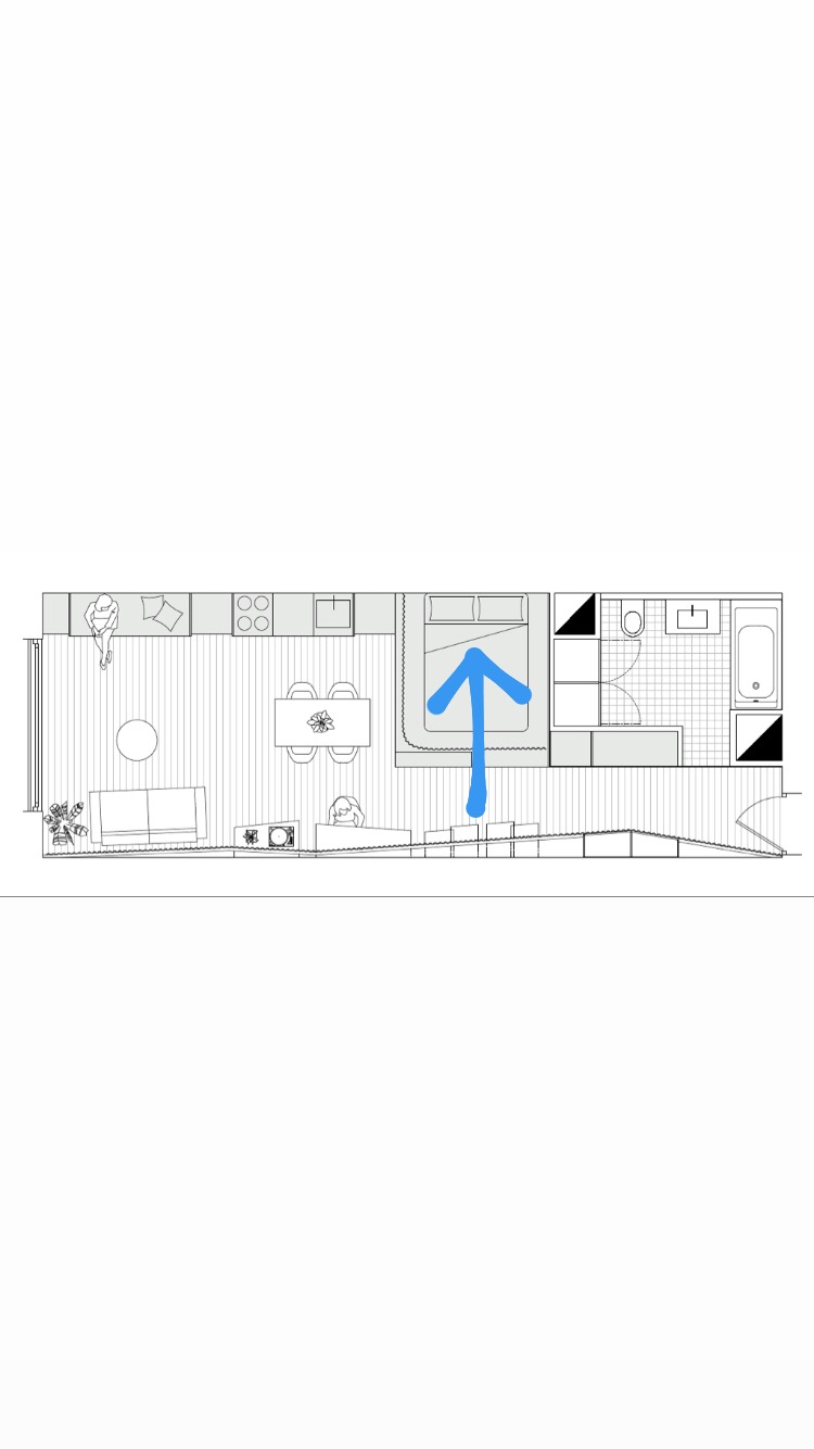 La chambre est délimitée par la structure du module. Les placards installés en hauteur créent une alcôve juste au-dessous, faisant office de tête de lit. L’estrade inscrit le coin nuit dans l’espace et sert de sommier au matelas.