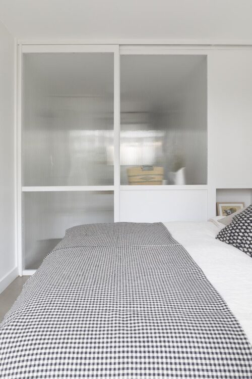 Une large cloison vitrée coulissante laisse filer la lumière naturelle jusque dans la salle d’eau.