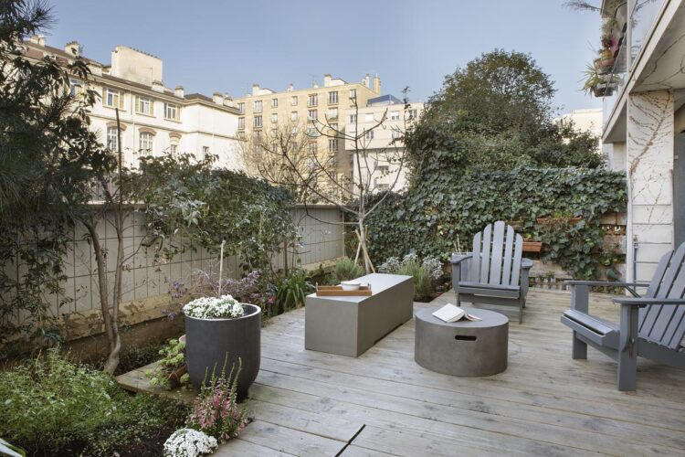 Habillée d’un sol en bois signé La Parqueterie Nouvelle et meublée de fauteuils Adirondack d’AMPM et de pièces en béton House Doctor, cette vaste terrasse offre un espace extérieur sans vis-à-vis, ouvert sur le ciel.