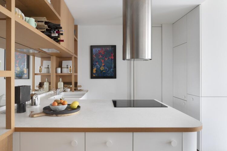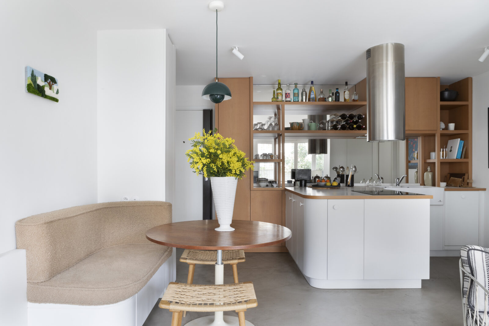 Un sol en résine signé Marius Aurenti unifie l’ensemble de l’appartement. Sa teinte douce met en valeur les matériaux et le mobilier, comme la cuisine au plan de travail en matériaux recyclés de chez Le Pavé, associée à l’électroménager Smeg.