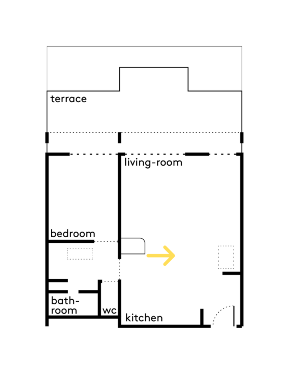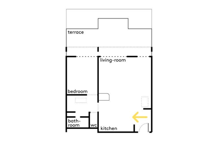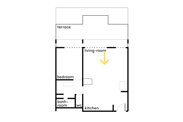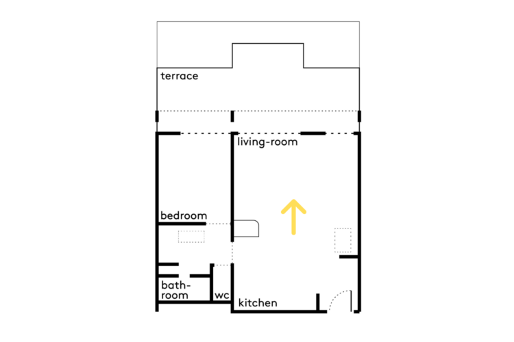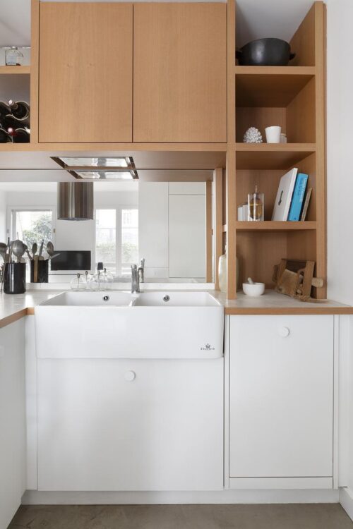 Cet appartement, situé dans un bâtiment datant du début des années 1970 en plein cœur du 11e arrondissement de Paris, est sublimé par ses grandes baies vitrées — typiques de ces années de construction — et sa terrasse accessible de toute part. Pour redonner de la luminosité à ce 45 mètres carrés, un gros travail de décloisonnement a été réalisé par l’architecte d’intérieur Isabelle Masson.
