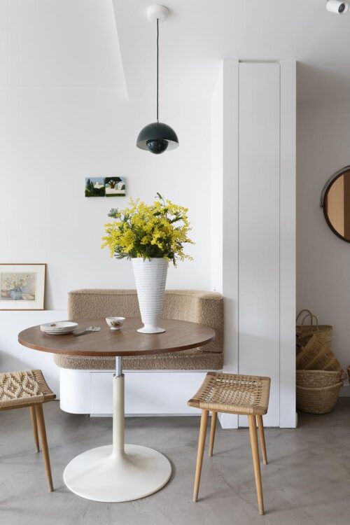 La salle à manger s’organise autour d’une table vintage Design Market et de tabourets de la Galerie Mobler, complétés par une banquette sur mesure habillée d’un tissu Shaun de Lamadrid, confectionnée par Émilie Van Roosebeke.