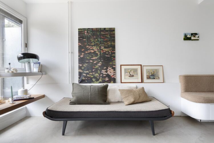 Côté salon, le canapé Maison de Vacances et la lampe Snoopy de Flos composent une atmosphère confortable et chaleureuse, propice à la détente.